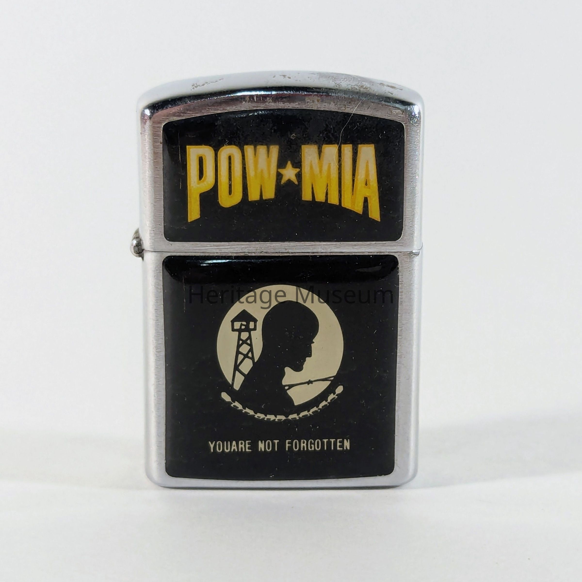 The image shows a lighter featuring the POW*MIA emblem and slogan "YOU ARE NOT FORGOTTEN"