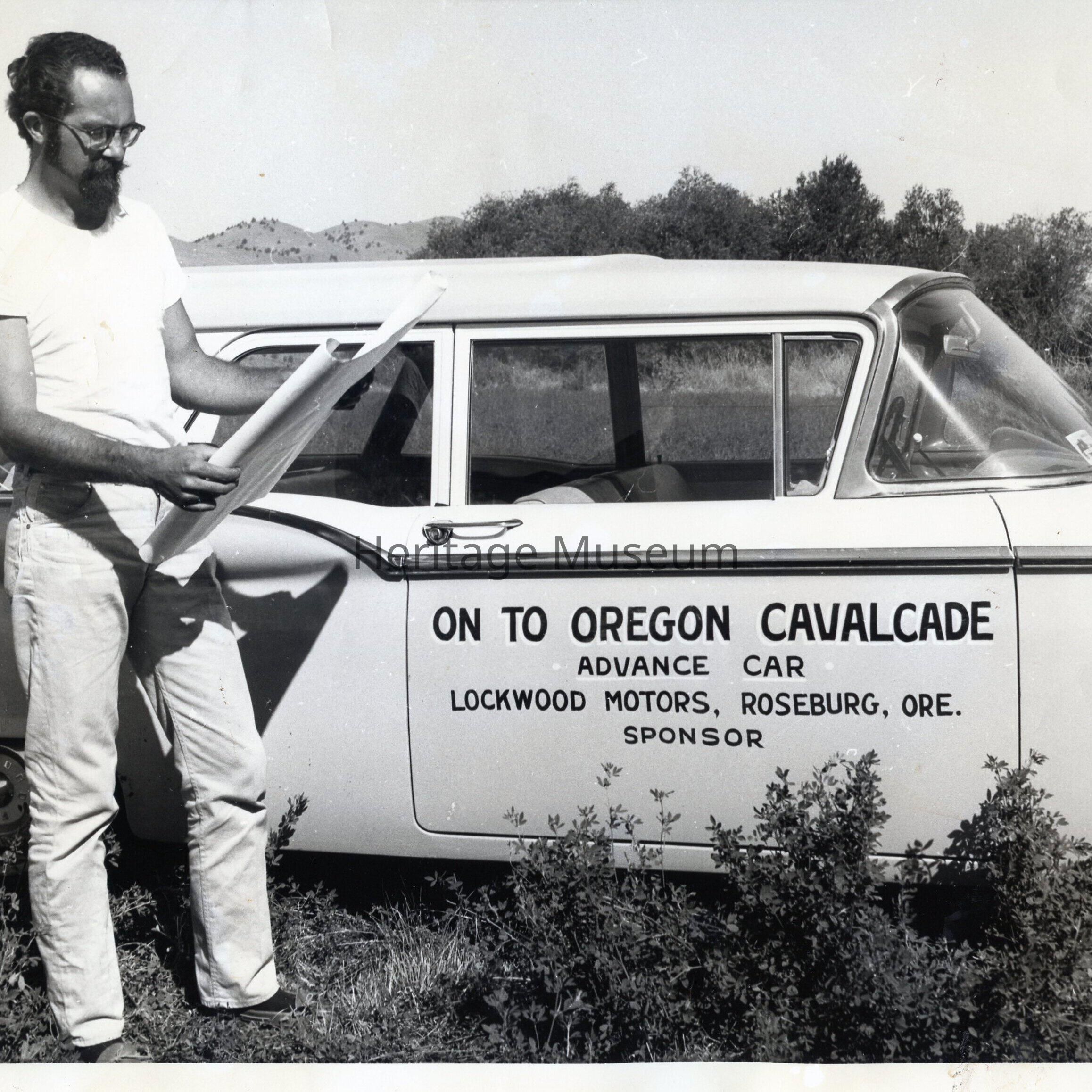 Dick Carter stands next to a car labeled "On to Oregon Cavalcade" while reading a map.