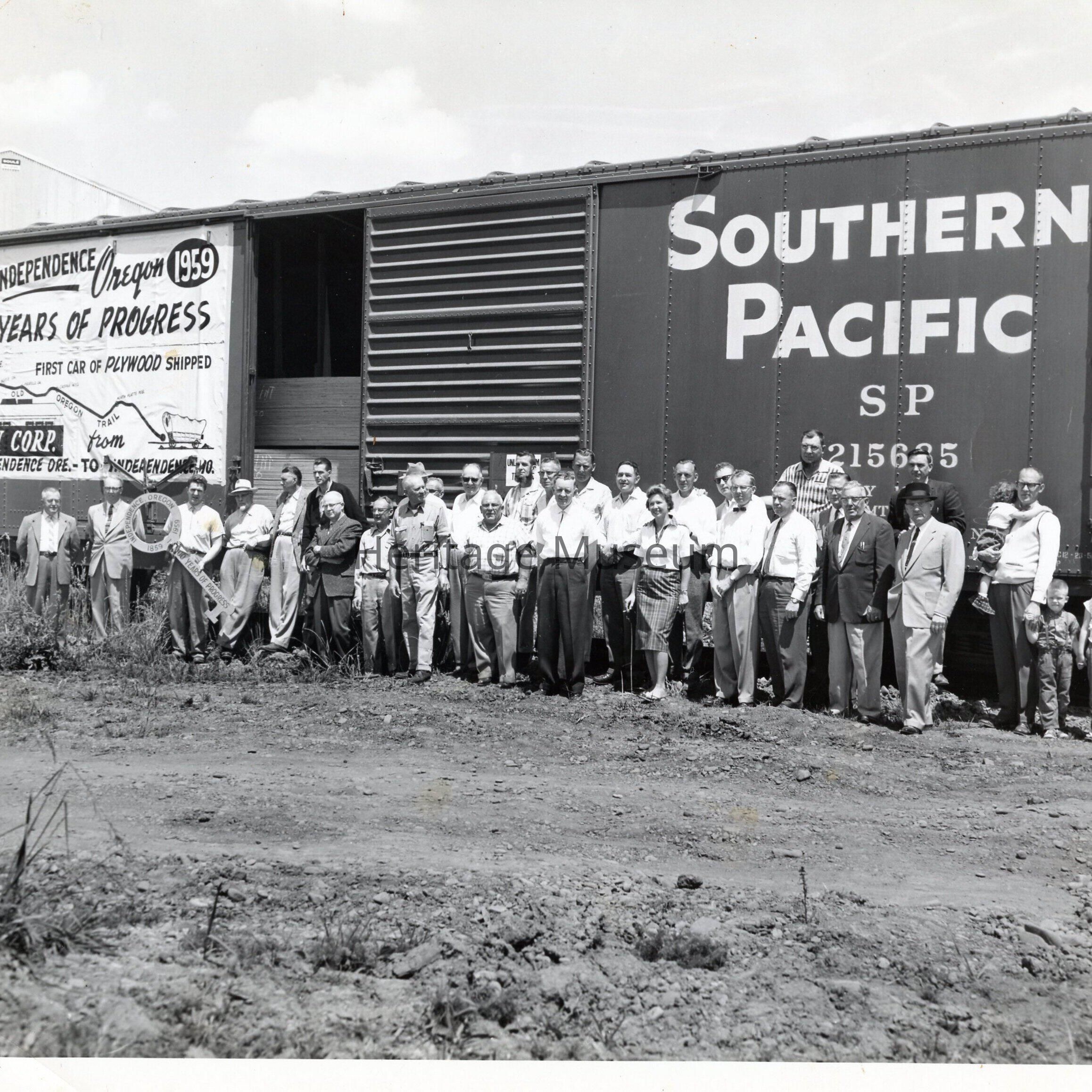 A group of people stands proudly beside a Southern Pacific railroad car