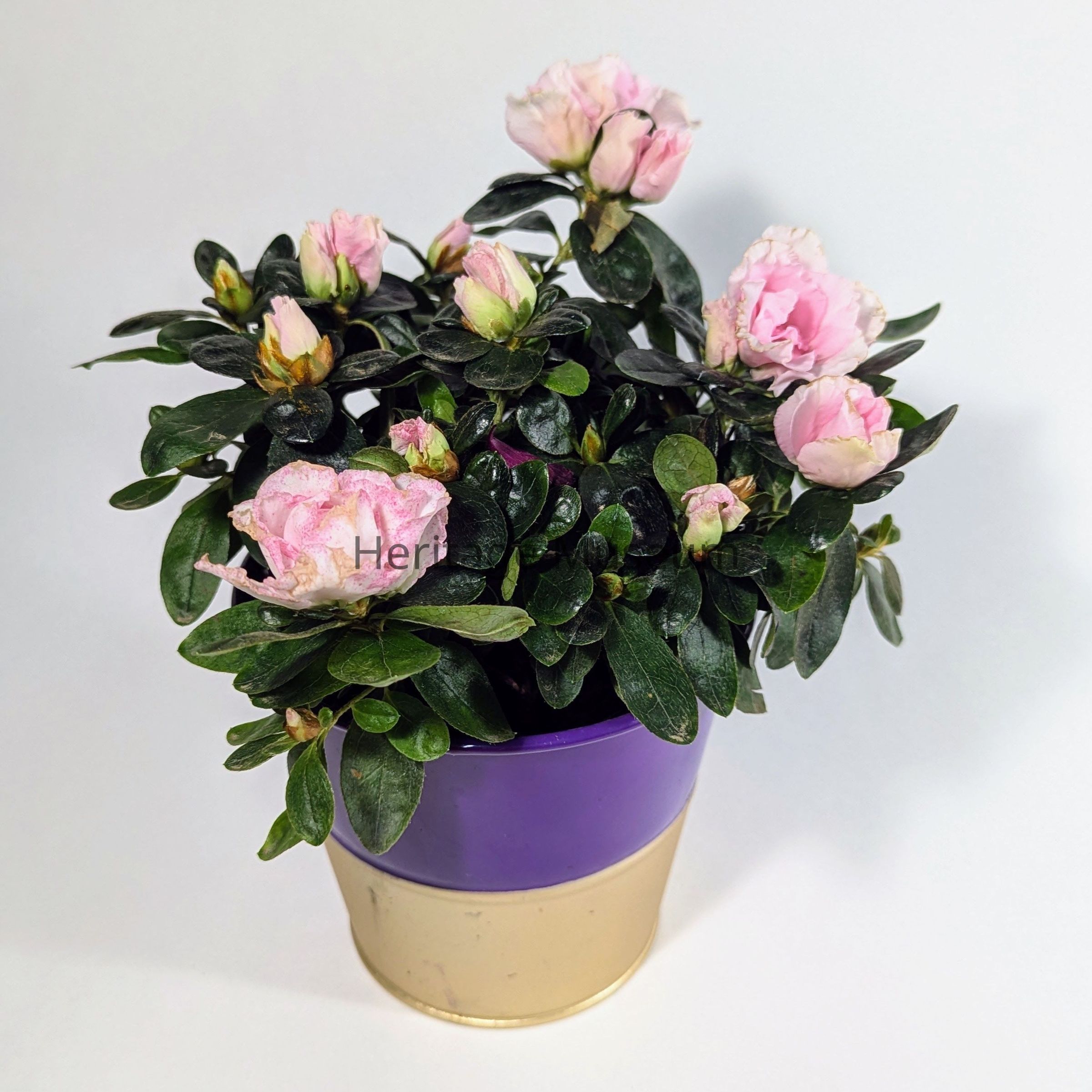 The image shows a pot of blooming pink flowers with lush green leaves, housed in a two-toned metal pot.