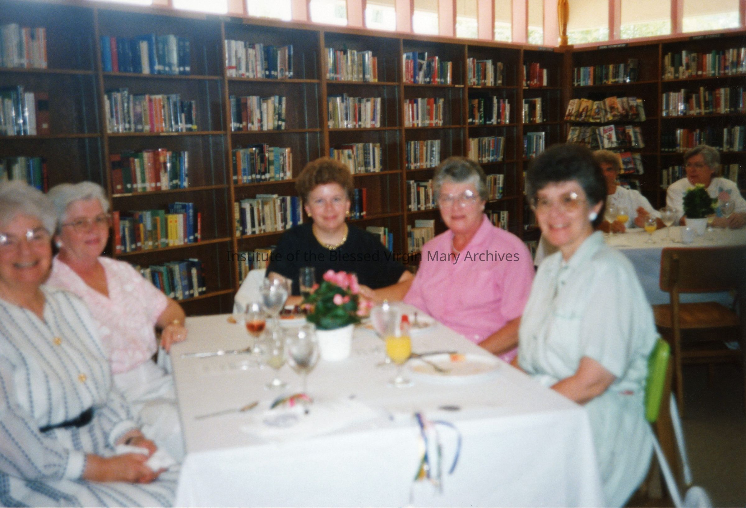 Gathering for Sister Jean Frye at Loretto High School in Sacramento, California. From left to right are unidentified, Sister Mary Ellen (Roland) Beck, Sister Helen Timothy, unidentified and Sister Arlene (Alma) Connolly. The event took place in the school's library.