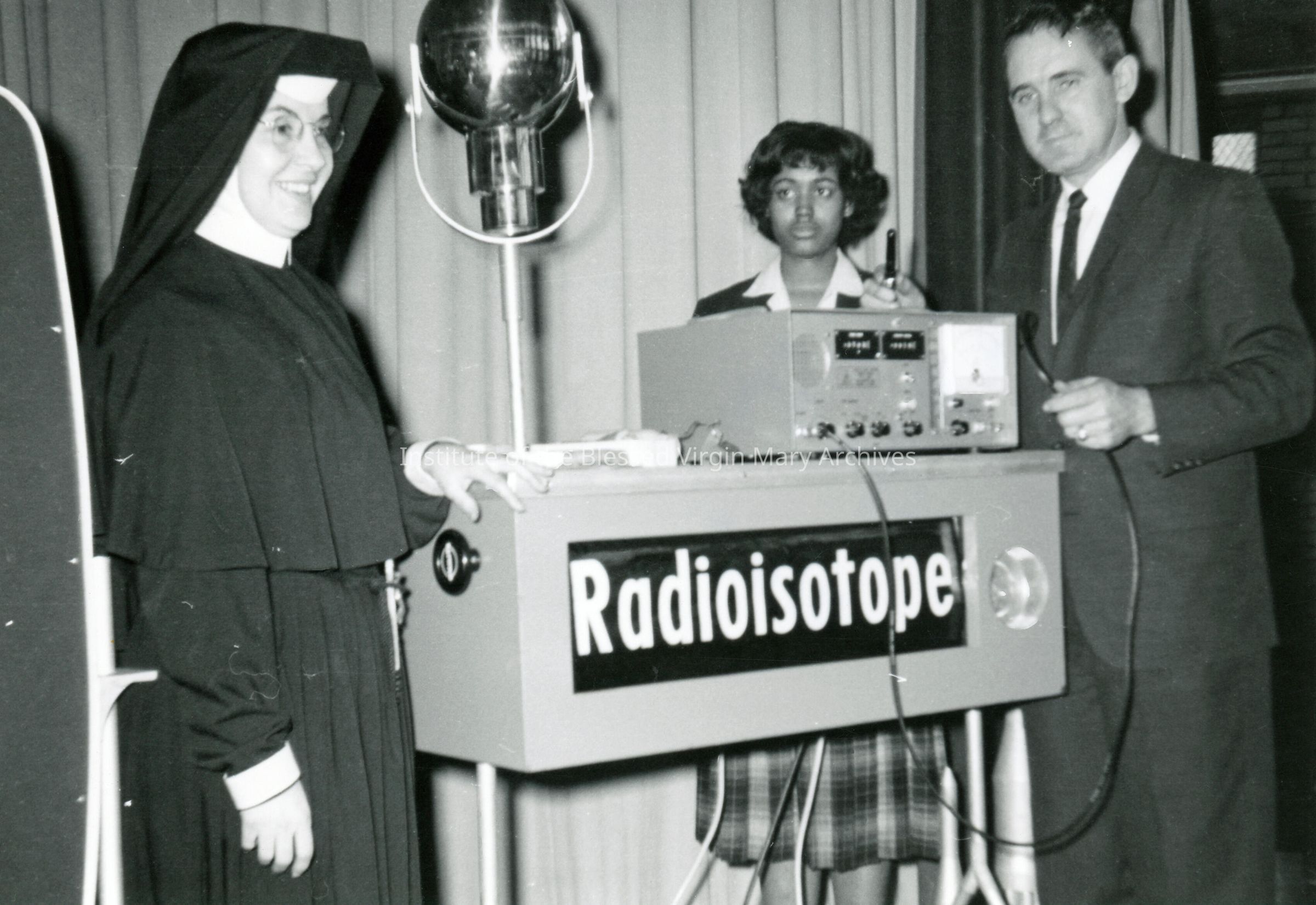 Sister Margaret (Aileen) O’Connor with a student from Loretto Academy Woodlawn. They are standing near a science fair exhibit labeled "Radioisotope".