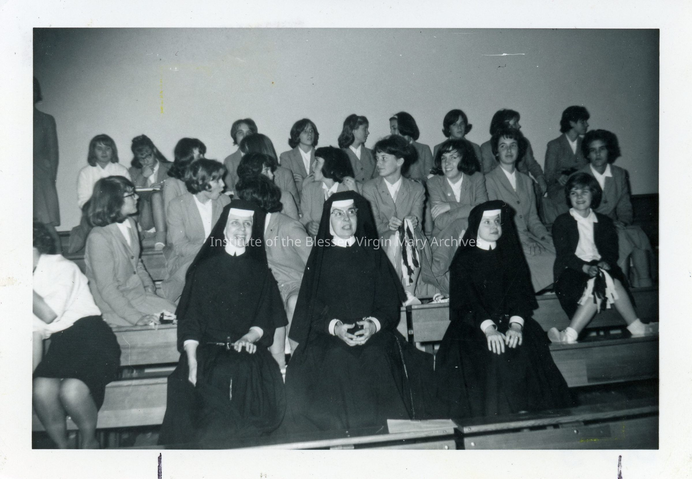 IBVM Sisters at Loretto High School in Sacramento, California. Seated near students, from left to right, are Sister Catherine (Celine) Oliva, Sister Margaret (Aileen) O'Connor and Sister Rita (Francis de Sales) Clarke.
