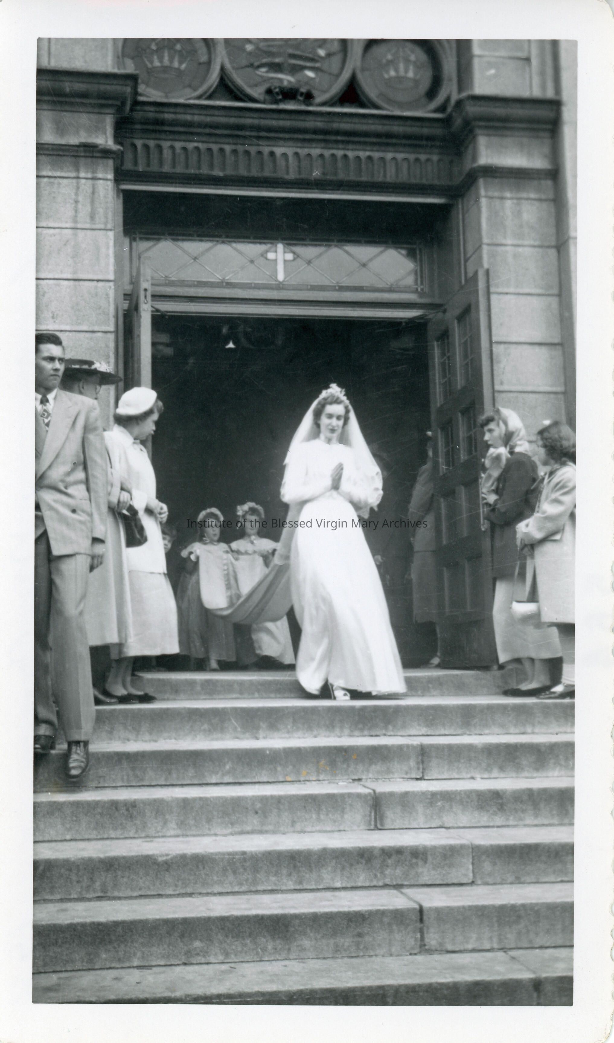 Loretto High School May Crowning in Englewood, Chicago. This image features student Margaret Vogt leaving St. Bernard Church. The school was located in the 6500 block of Stewart Avenue.