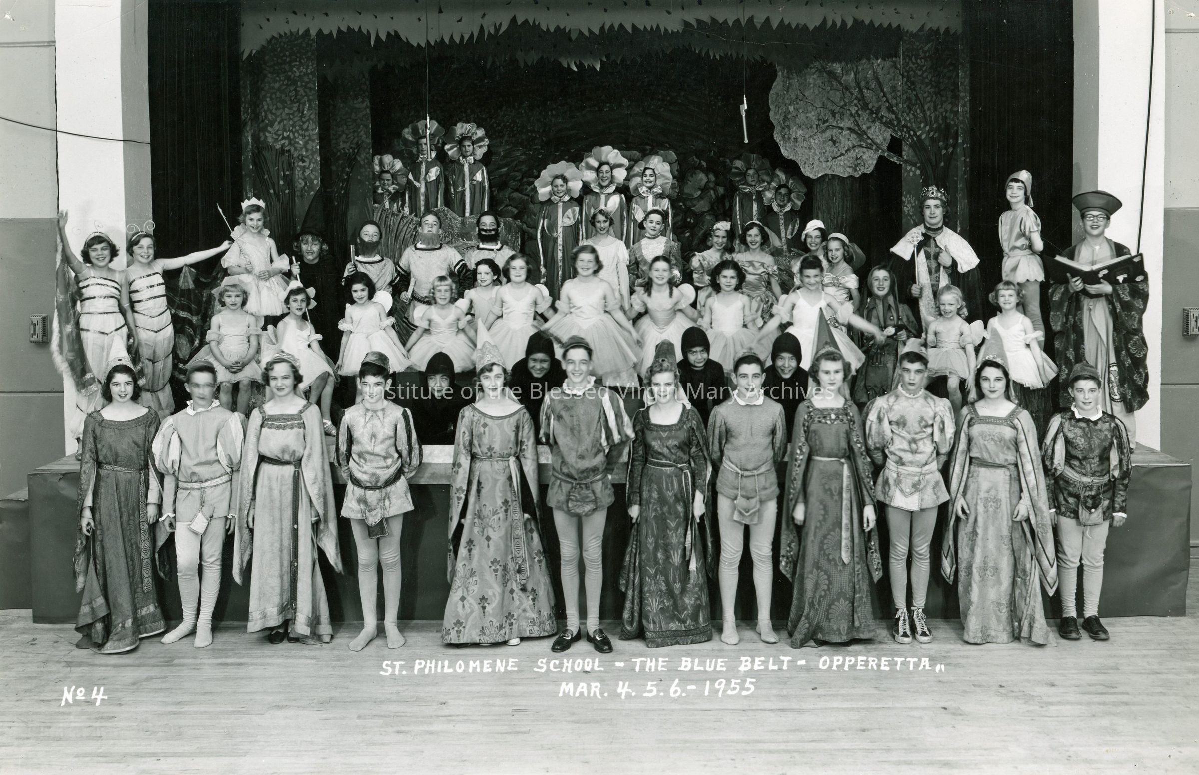 St. Philomene's School located at 2320 El Camino Avenue in Sacramento, California. This image features a student play titled "The Blue Belt Operetta". The director is listed as Sister Agnes (Catalda) Labelle.