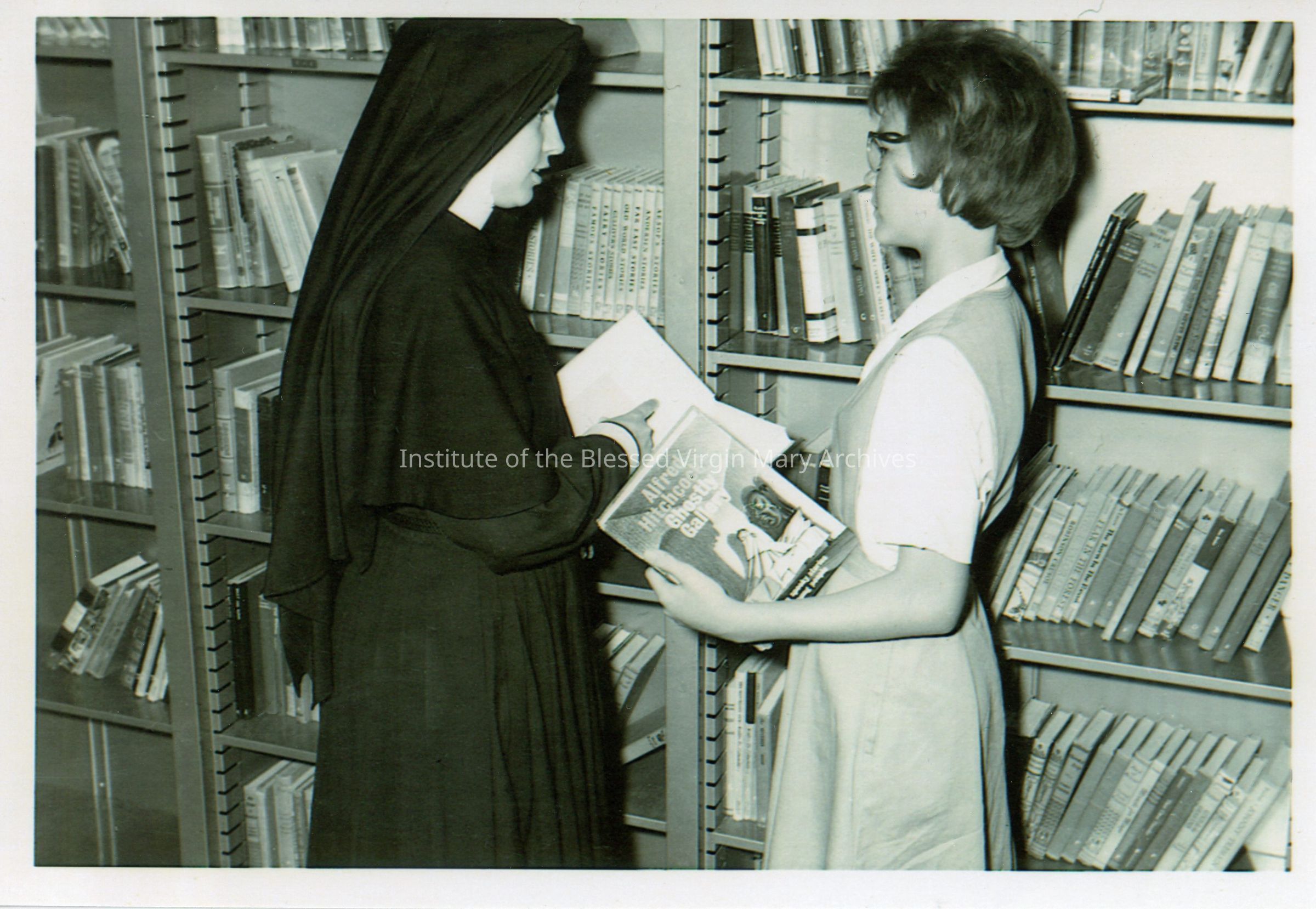 Loretto High School in Sacramento, California. An IBVM Sister is speaking with a student in the library.