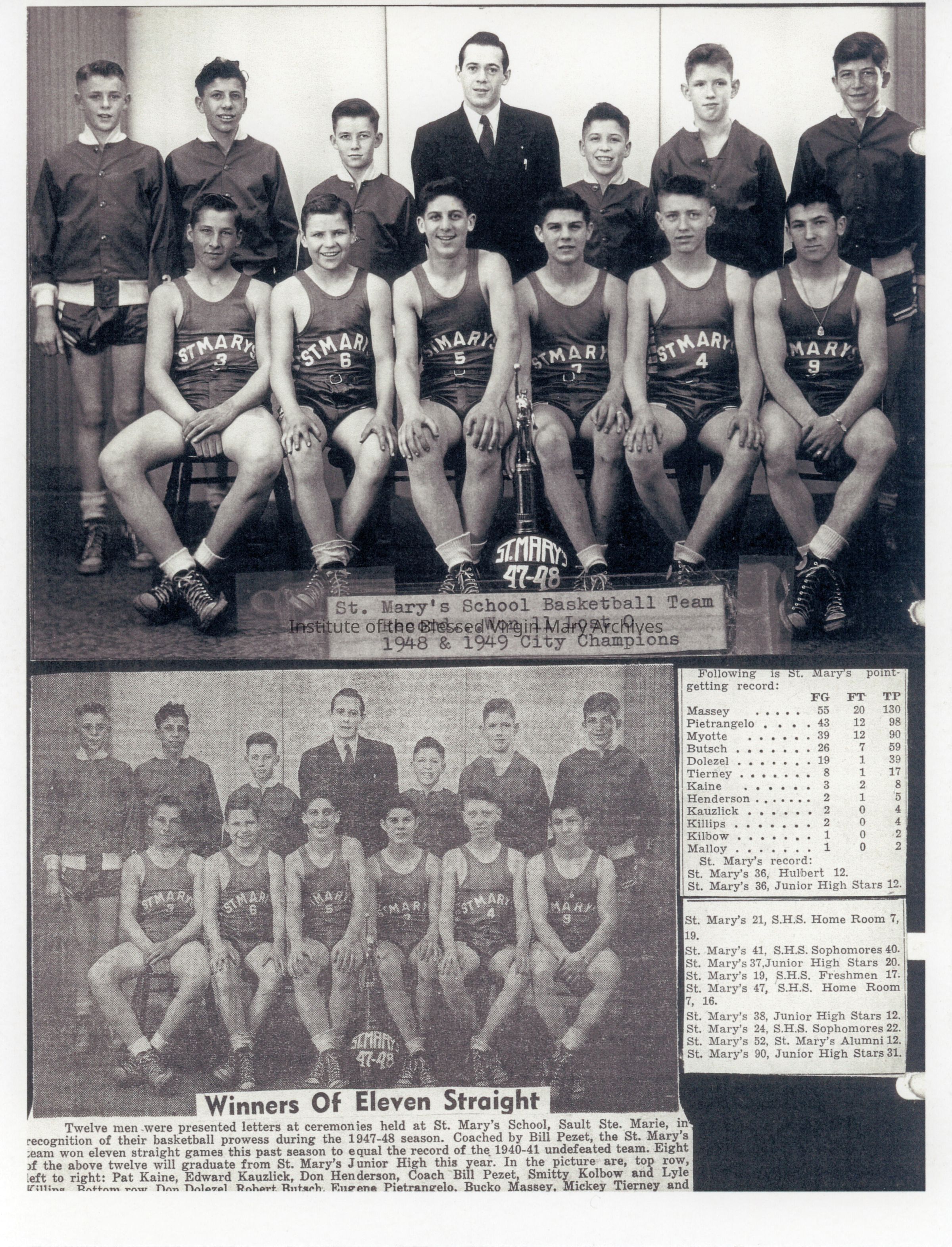Members of the St. Mary’s Elementary Basketball Team between 1948 and 1949. Bill Pezet is listed as coach and an accompanying newspaper article describes the team's undefeated season. The school was located at 360 Maple Street in Sault Ste. Marie, Michigan.
