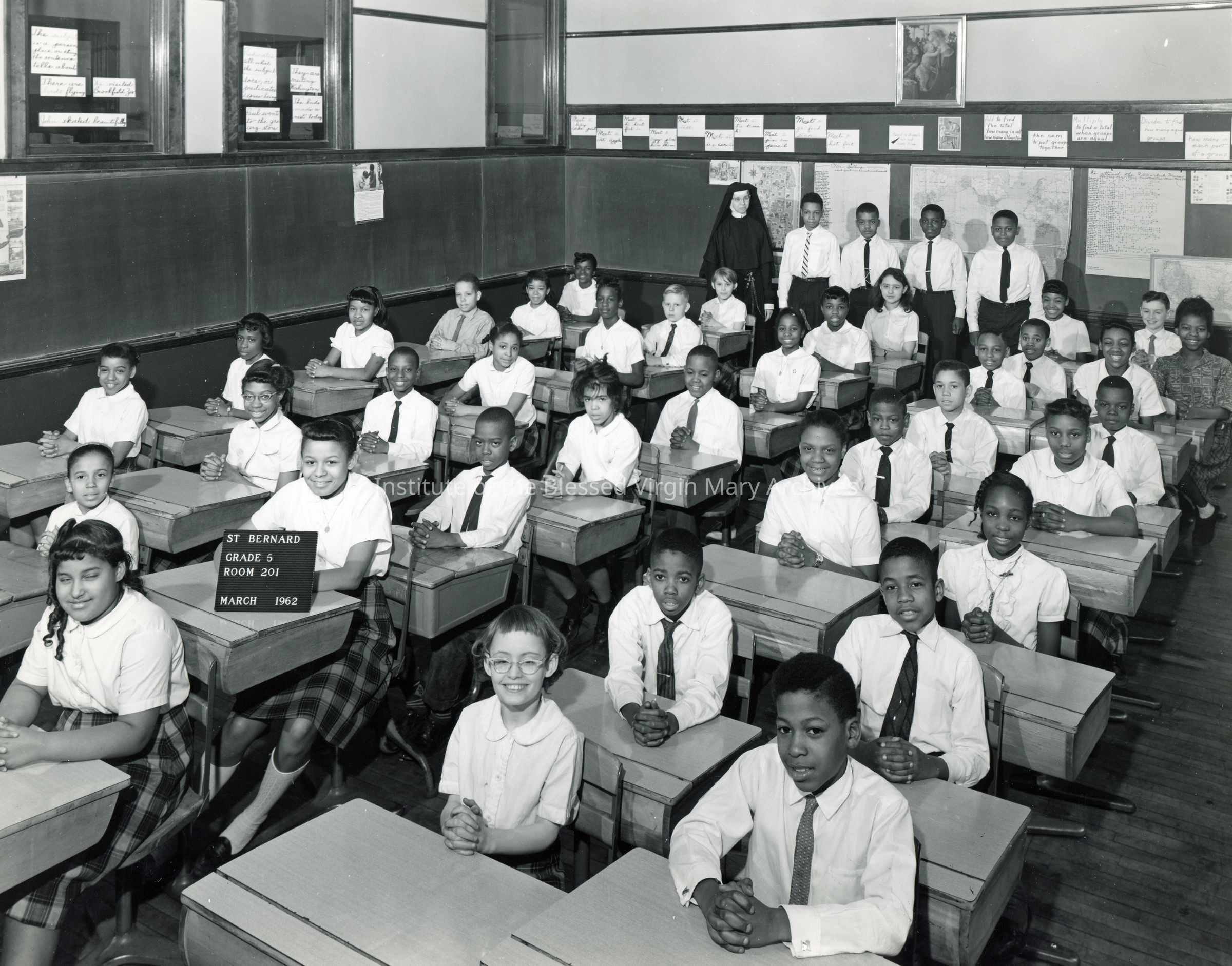 St. Bernard Grammar School fifth grade class. Sister Joy (St. Andrew) Miller is standing at the back. The school was located in the 6500 block of Stewart Avenue in Englewood, Chicago.