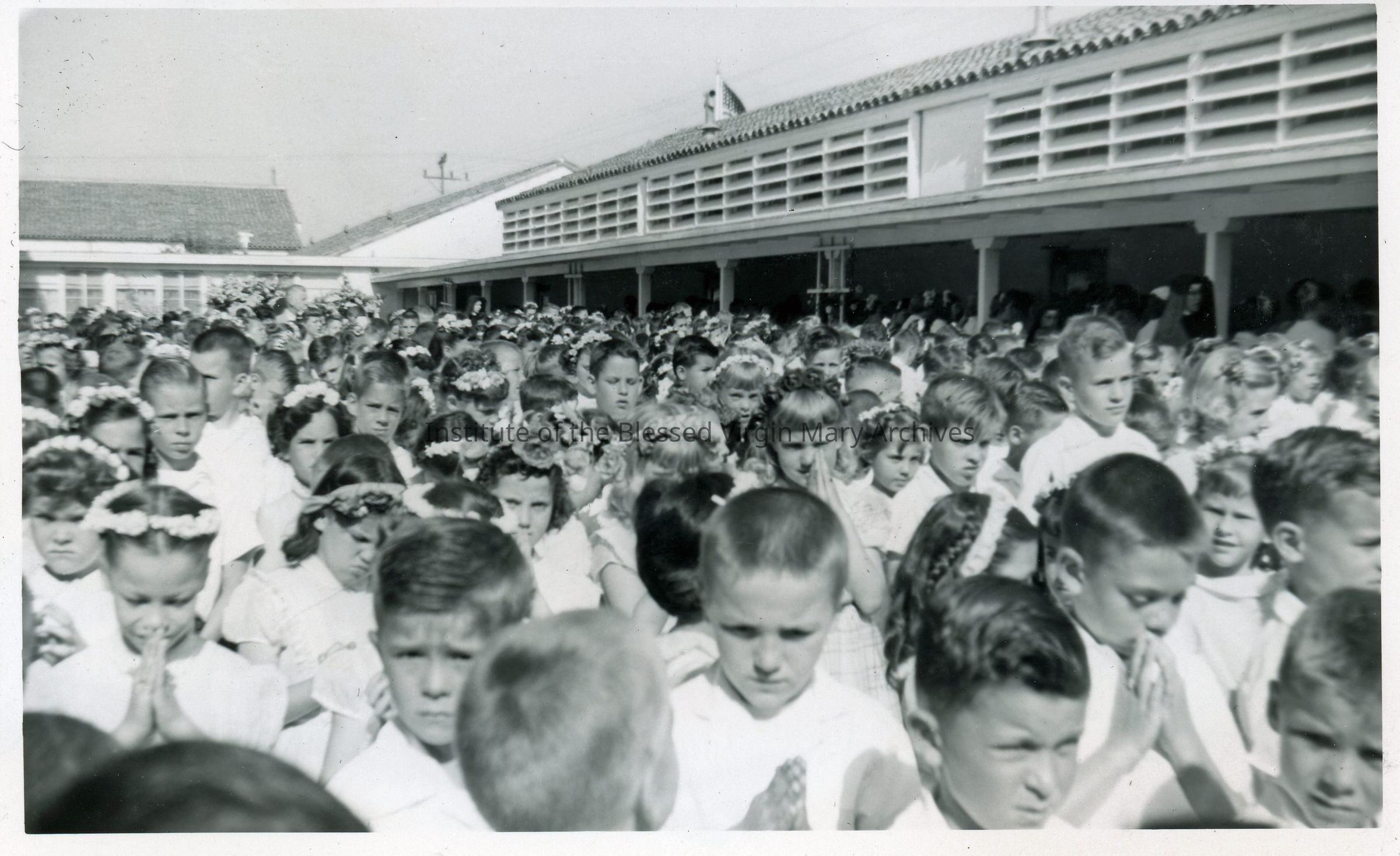 St. Philomene's School located at 2320 El Camino Avenue in Sacramento, California. This image features students gathered outside, possibly for First Communion.