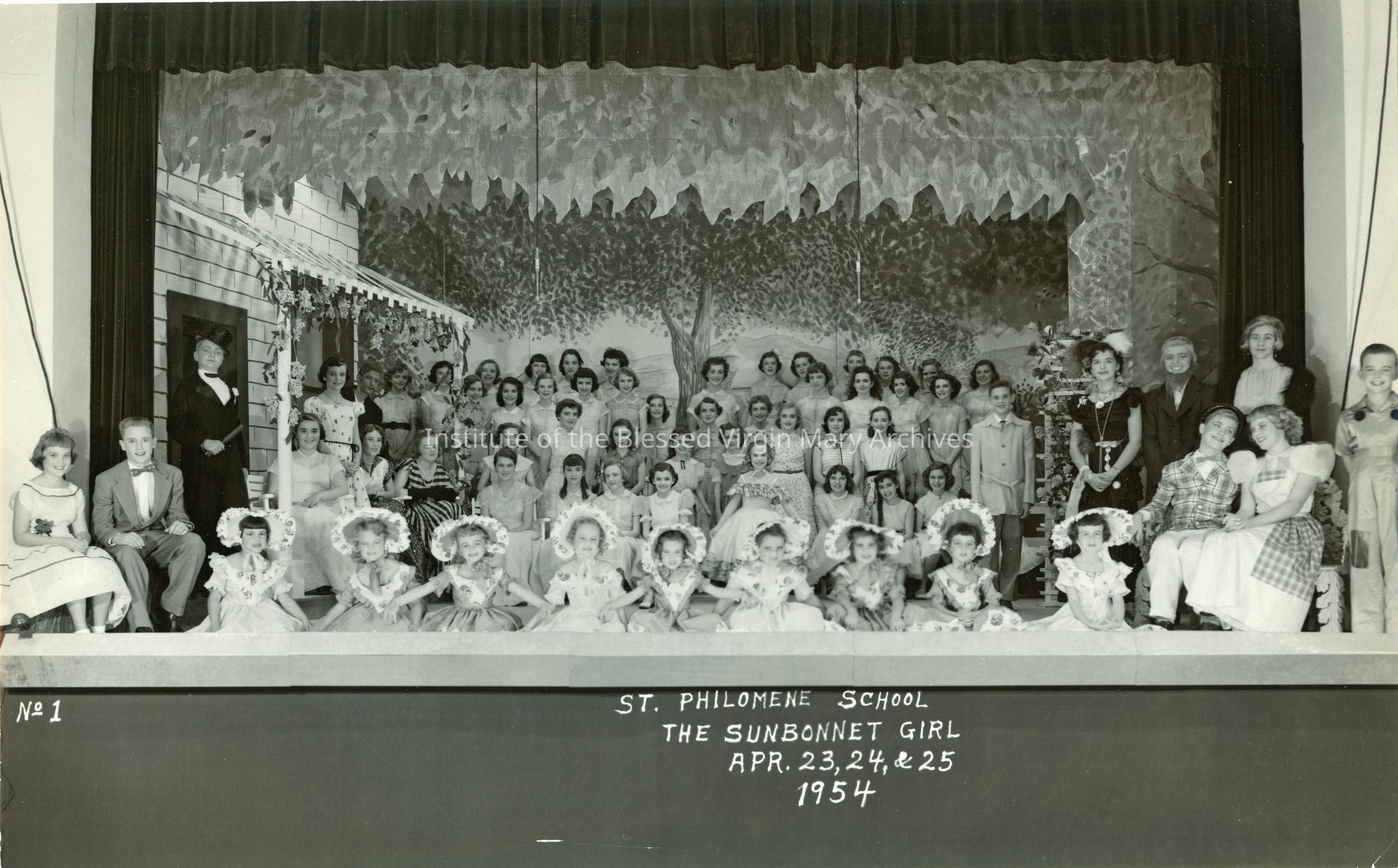 St. Philomene's School located at 2320 El Camino Avenue in Sacramento, California. This image features a student play titled "The Sunbonnet Girl". The director is listed as Sister Agnes (Catalda) Labelle.