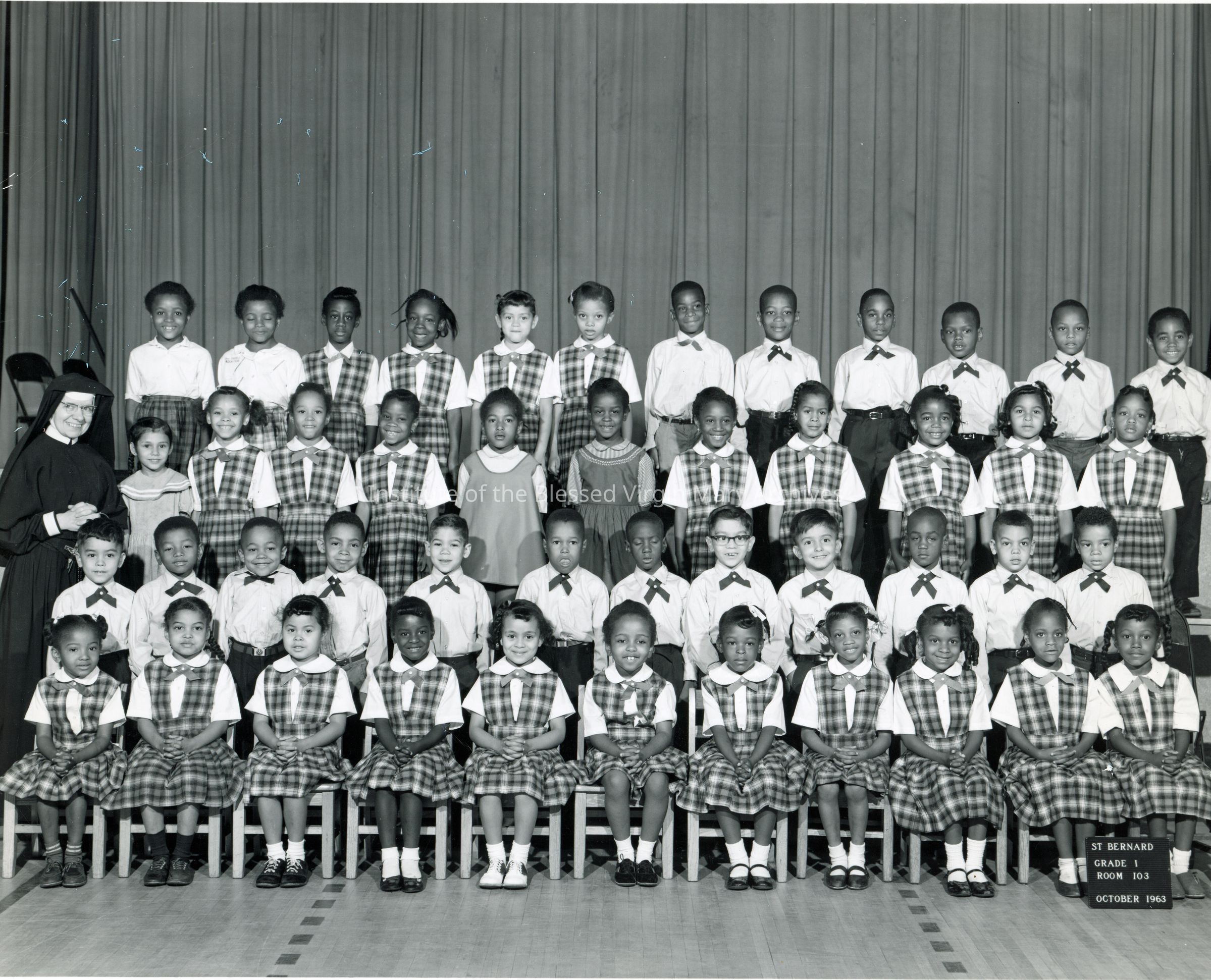 St. Bernard Grammar School first grade class. Sister Marie (Stanislaus) Drummond is on the left. The school was located in the 6500 block of Stewart Avenue in Englewood, Chicago.