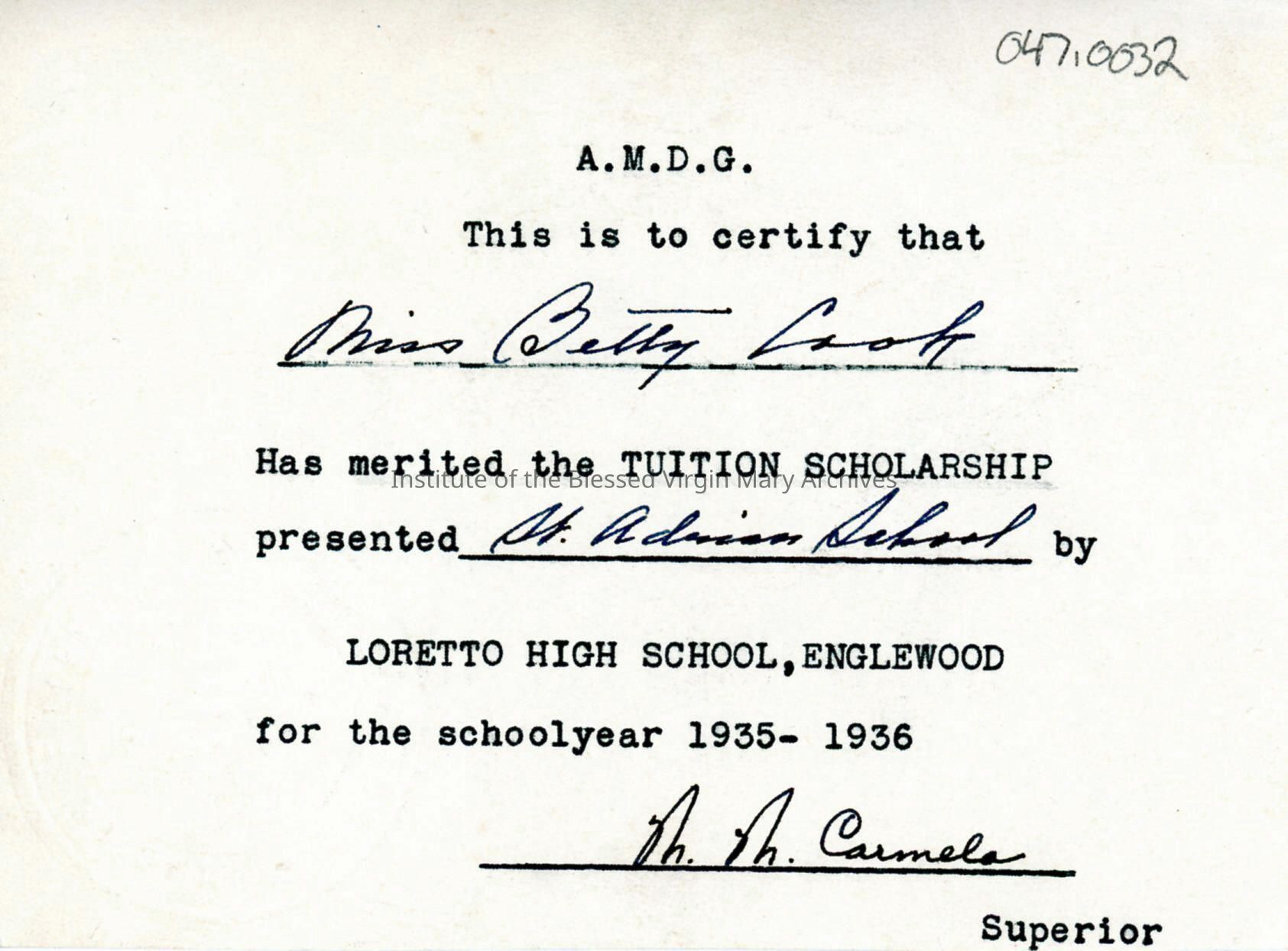 Loretto High School Englewood tuition scholarship card awarded to Betty Cook, then a student at St. Adrian School.