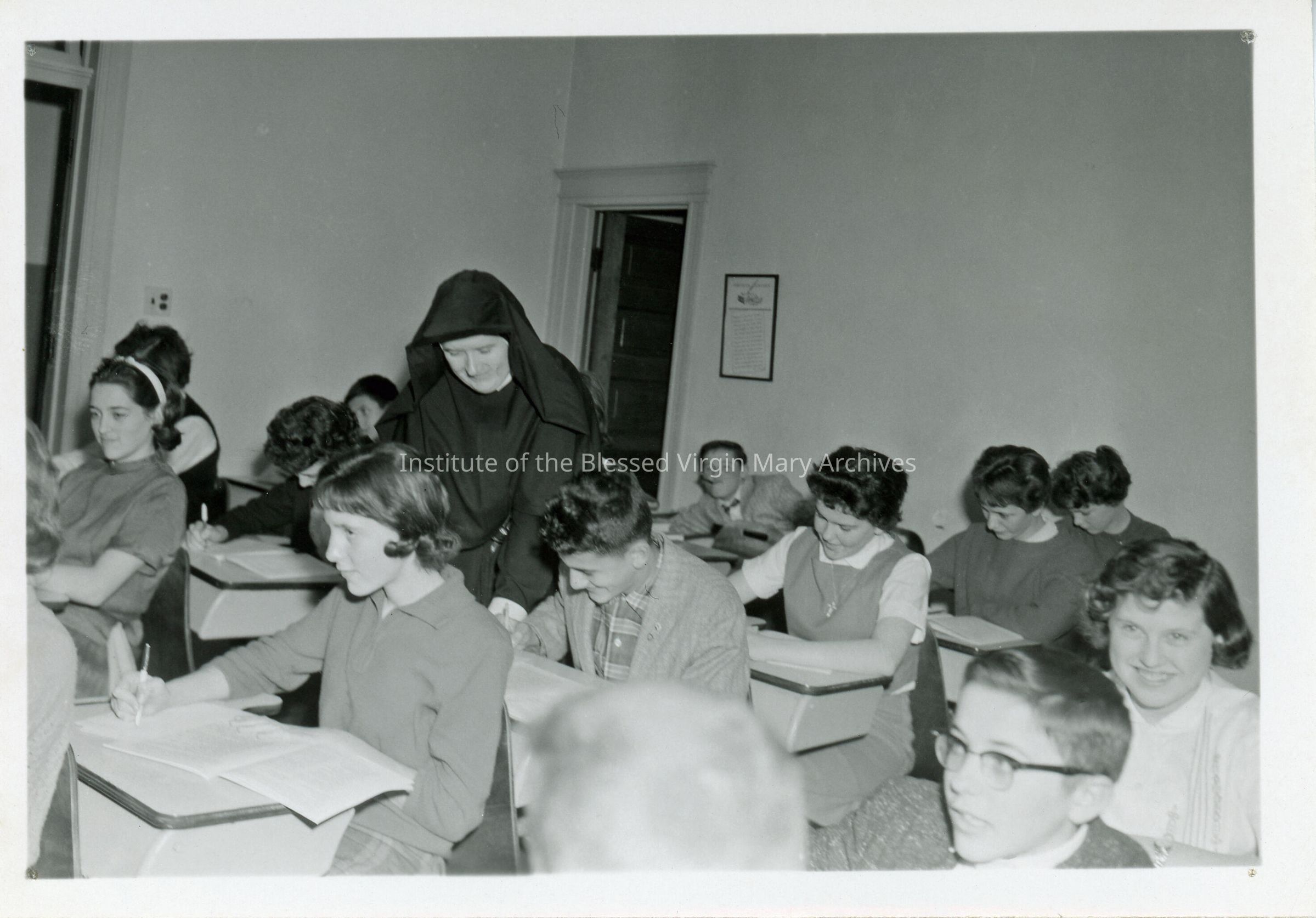 Loretto High School, formerly Loretto Academy, in Sault Ste. Marie, Michigan. This image features an unidentified sister instructing students. Founded in 1896, the academy's location at 377 Armory Place (pictured) opened in 1899 and underwent a substantial addition in 1910. Converted into a co-ed high school in 1944, it was demolished in 1966 after Loretto Catholic Central High School was constructed.