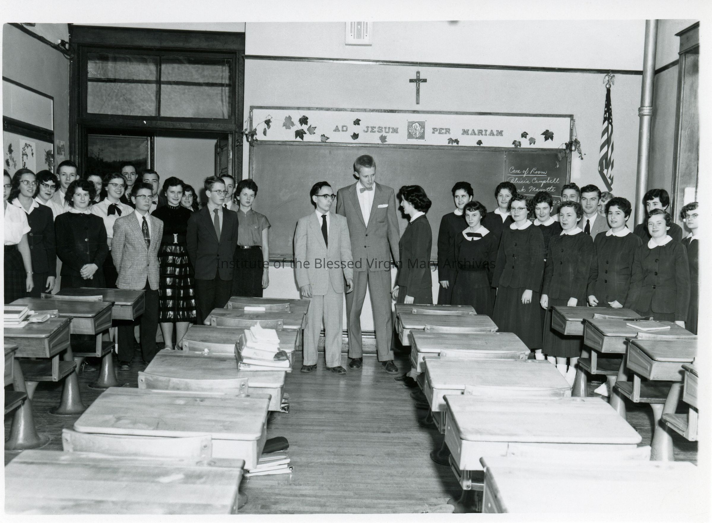 Loretto High School, formerly Loretto Academy, in Sault Ste. Marie, Michigan. This image features students gathered in a classroom. Founded in 1896, the academy's location at 377 Armory Place (pictured) opened in 1899 and underwent a substantial addition in 1910. Converted into a co-ed high school in 1944, it was demolished in 1966 after Loretto Catholic Central High School was constructed.