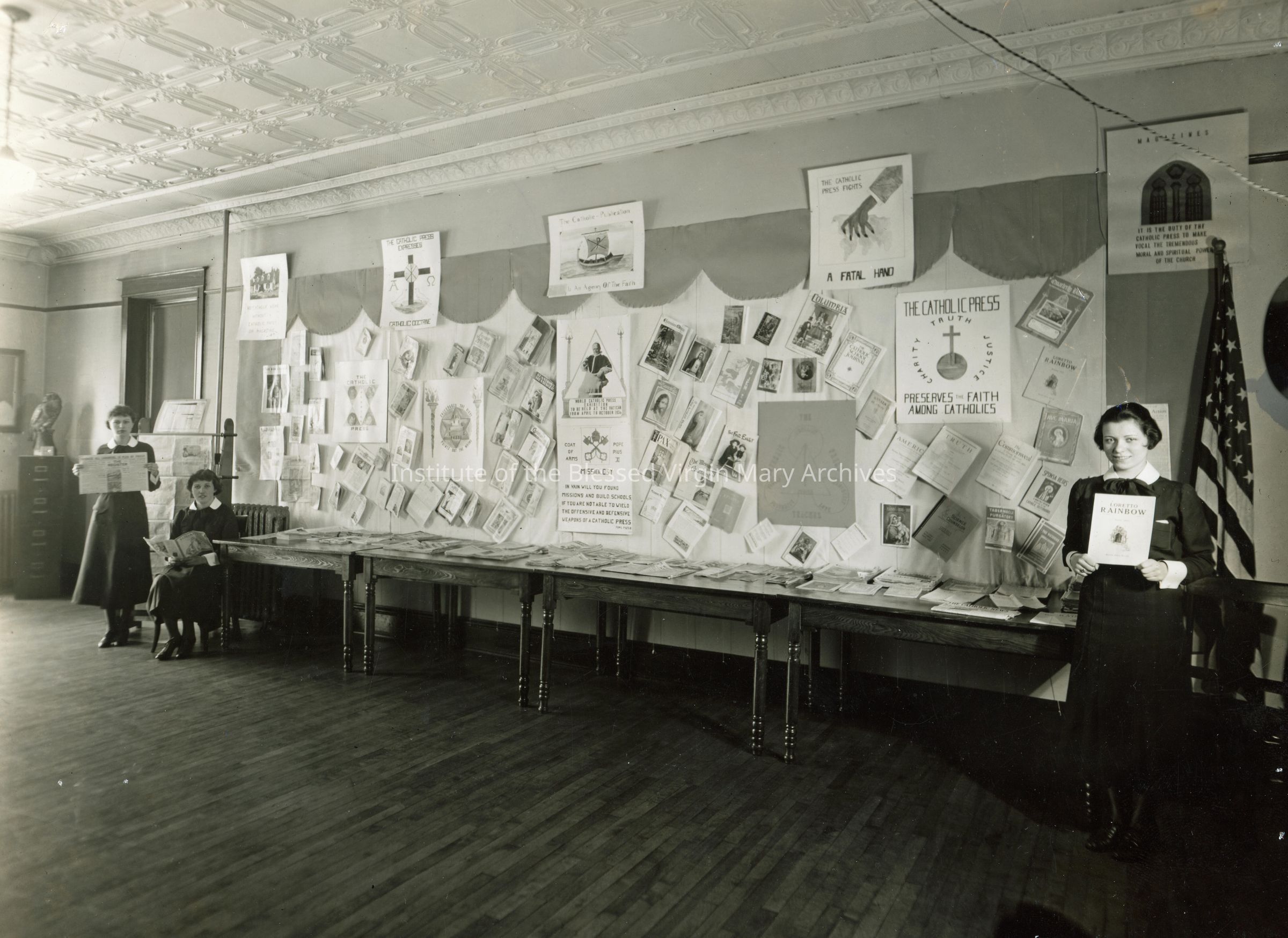 Students at Loretto Academy in Sault Ste. Marie, Michigan. They are standing near a display featuring Catholic publications. Founded in 1896, the academy's location at 377 Armory Place (pictured) opened in 1899 and underwent a substantial addition in 1910. Converted into a co-ed high school in 1944, it was demolished in 1966 after Loretto Catholic Central High School was constructed.
