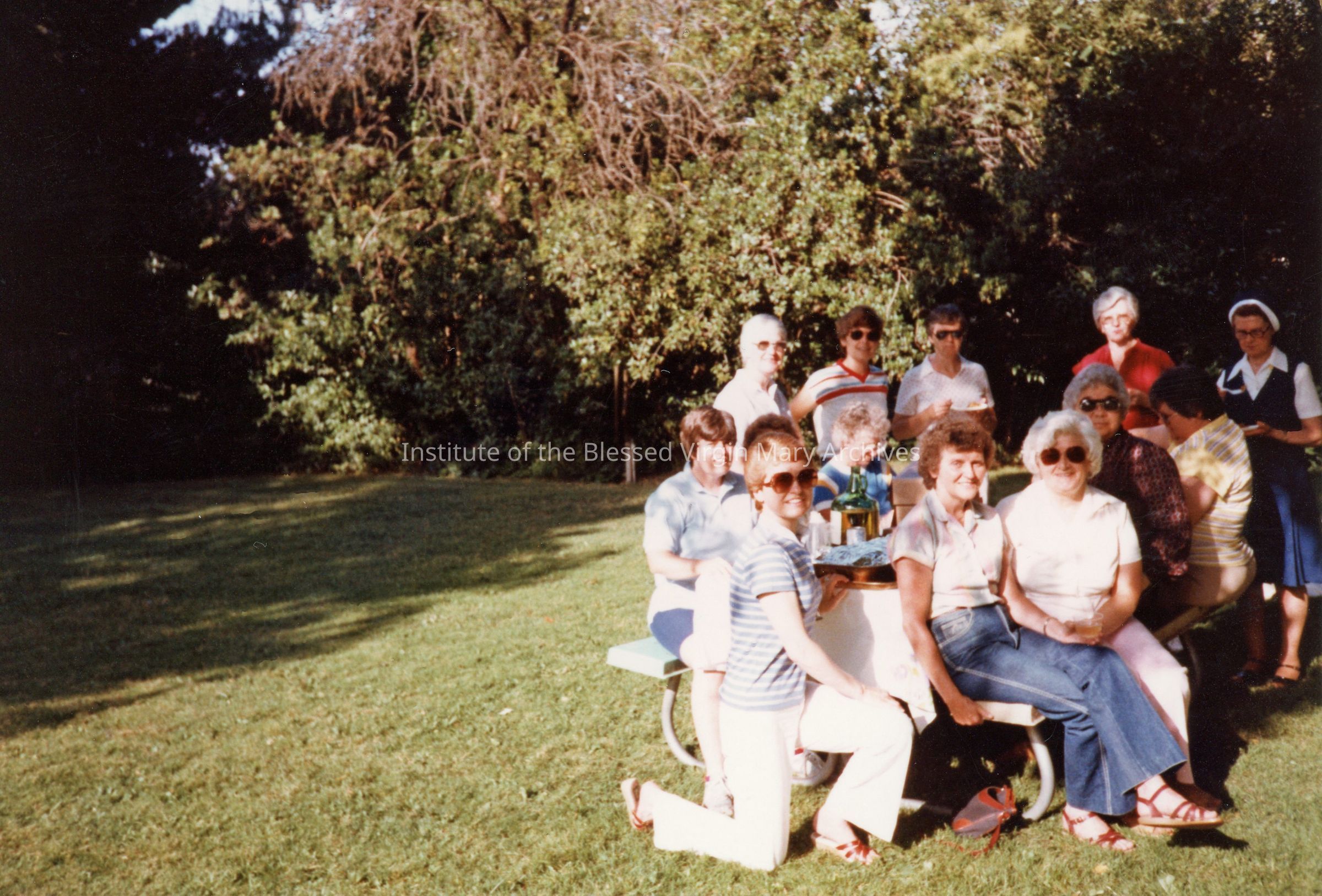 IBVM Sisters attending the St. Philomene's picnic in Sacramento, California. In the back row, from left to right, are Sister Mary Howard Moriarty, Sister Elaine Iwanski, Sister Esther (Damian) O'Mara, Sister Mary Ellen (Roland) Beck and Sister Dorothy (Wilhelmine) Fromm. In the middle row, from left to right, are Sister Mary Carton, Sister Edith (Blanche) Turgeon, Sister Marion (de Chantal) Willis and Sister Jean Frye. In the front row, from left to right, are Sister Frances (Maria Regina) Bierer, Sister Patricia (Trinita) Pendleton and Sister Nora (St. Catharine) Lowe.