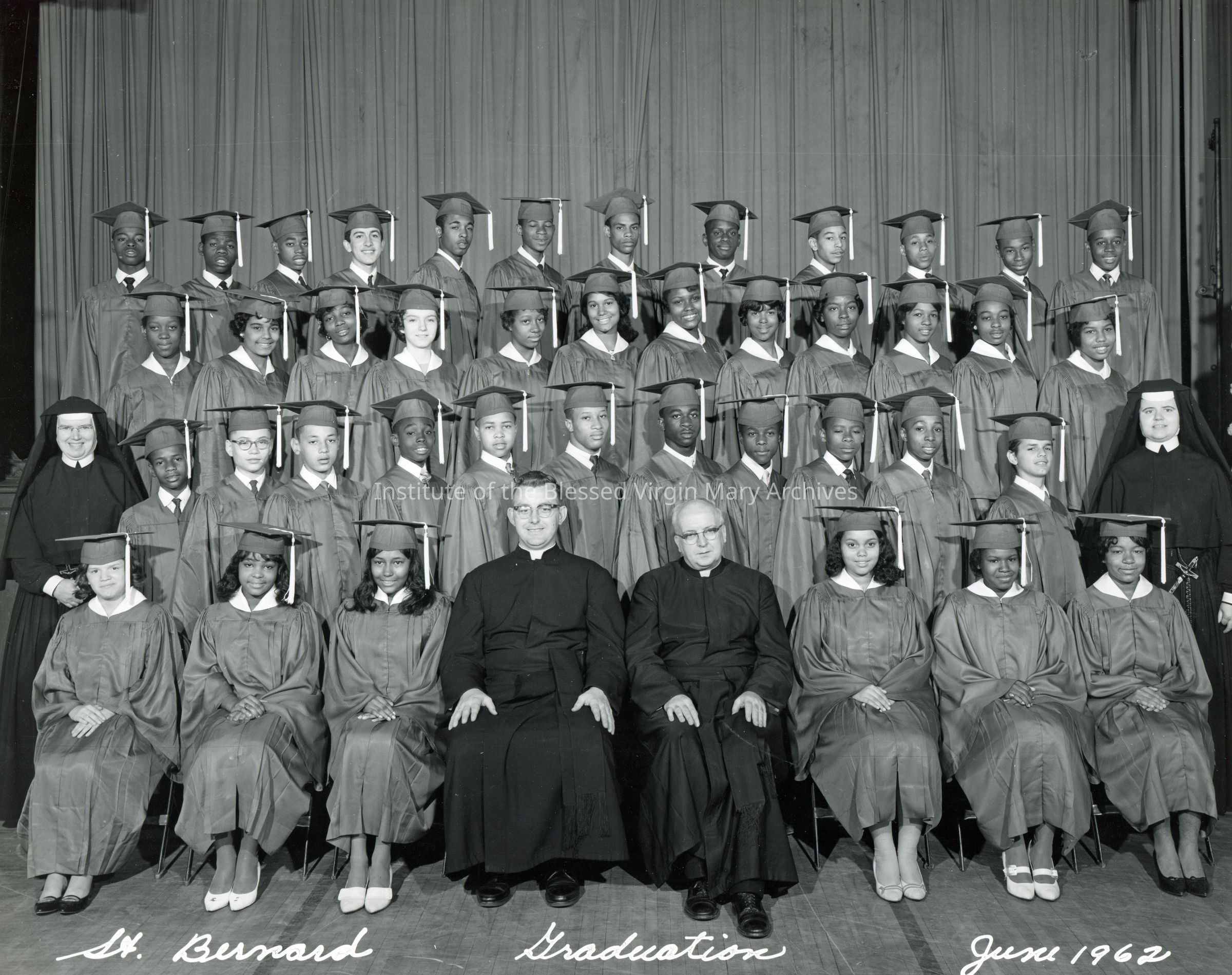 St. Bernard Grammar School Class of 1962. Sister Marie (Stanislaus) Drummond is on the left and Sister Dolores Ann (Evelyn) McCloskey is on the right. The school was located in the 6500 block of Stewart Avenue in Englewood, Chicago.