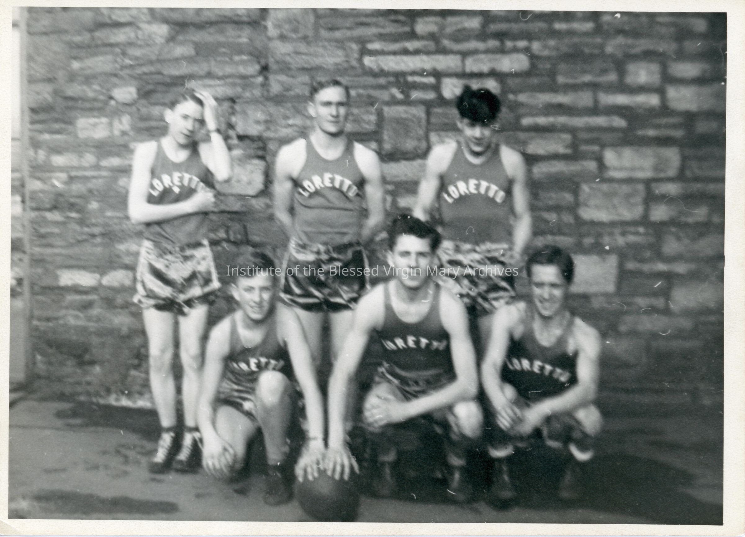 A student basketball team at Loretto Academy/Loretto High School in Sault Ste. Marie, Michigan. Founded in 1896, the academy's location at 377 Armory Place (pictured) opened in 1899 and underwent a substantial addition in 1910. Converted into a co-ed high school in 1944, it was demolished in 1966 after Loretto Catholic Central High School was constructed.