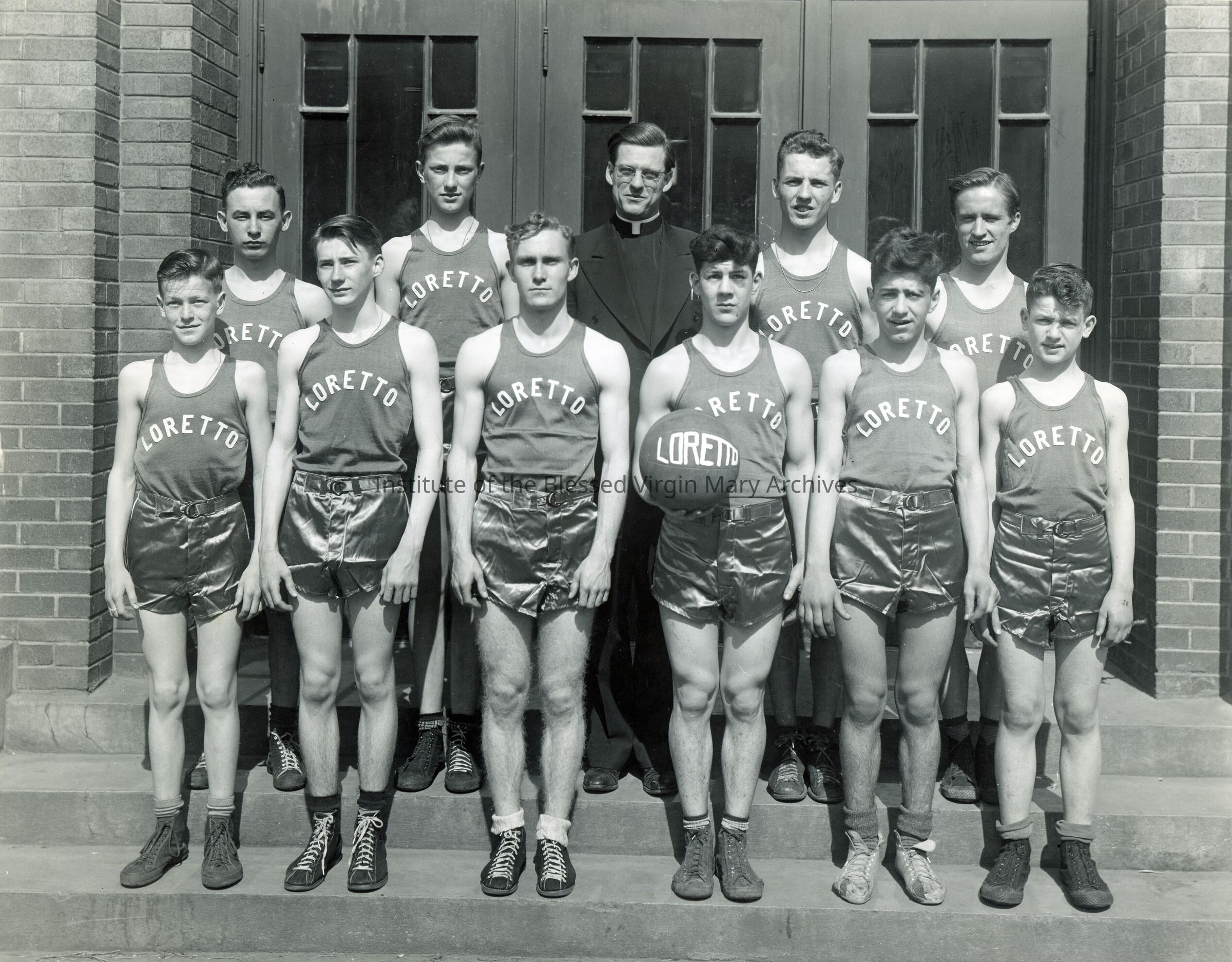A student basketball team from Loretto Academy/Loretto High School in Sault Ste. Marie, Michigan. Father Elmer J. Bares, who coached the team, is present. There are also a number of names handwritten on the back. Founded in 1896, the academy's location at 377 Armory Place opened in 1899 and underwent a substantial addition in 1910. Converted into a co-ed high school in 1944, it was demolished in 1966 after Loretto Catholic Central High School was constructed.