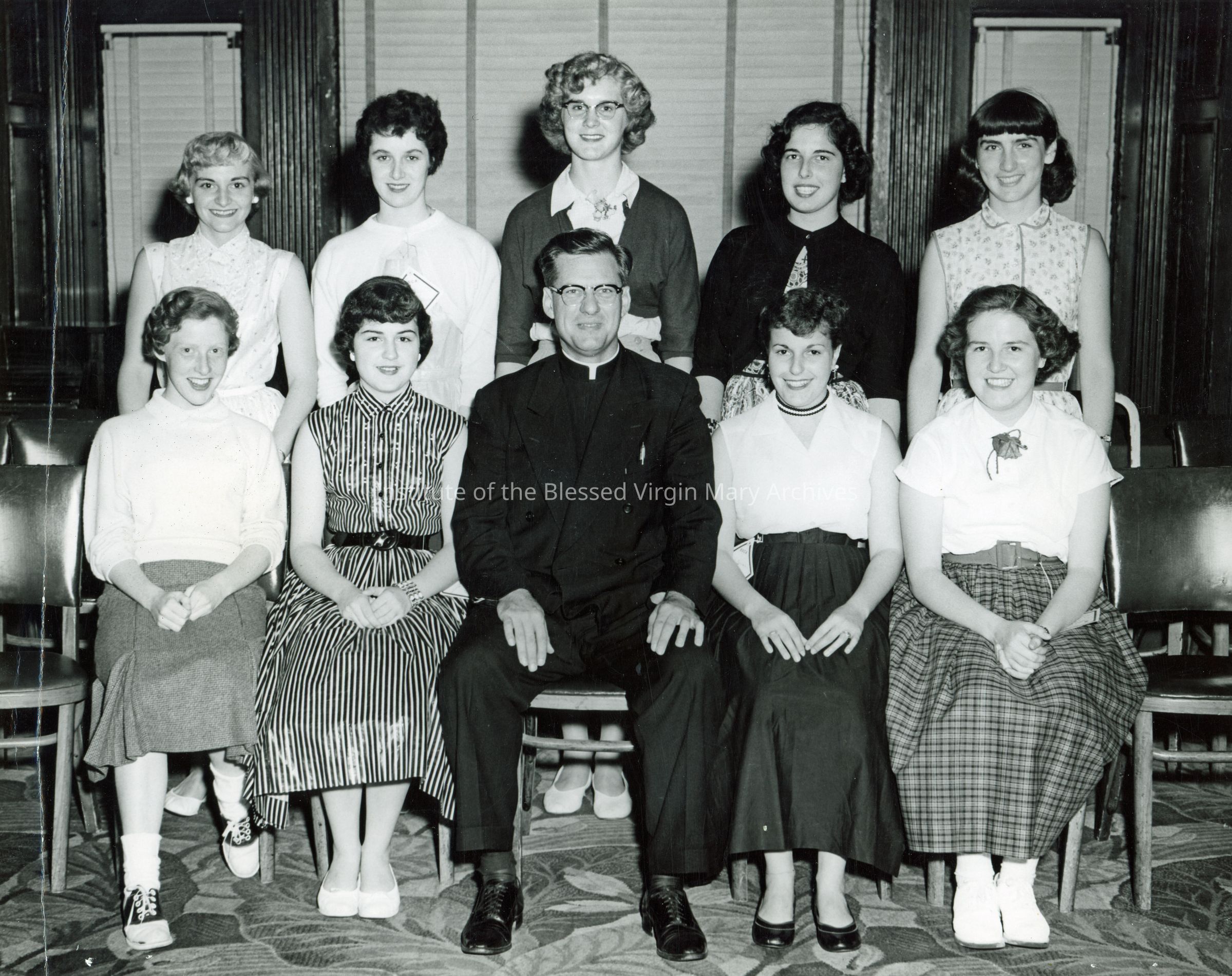 Members of the Loretto High School, formerly Loretto Academy, Sodality Club in Sault Ste. Marie, Michigan. From left to right, seated, are Judy Macmaster, Donna Willette, Father Elmer J. Bares, Helen Molinaro and Helen Shipman. From left to right, standing, are Sara de Paul, Constance Jacques, Phyllis Sipieneski, Constance Booth and Dolores DeLuca. This photo was taken at the Summer School of Catholic Action held in Chicago, Illinois.