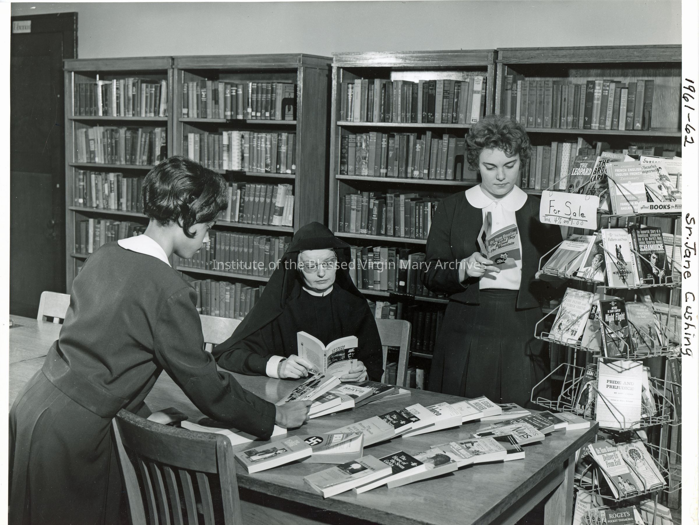 Sister Jane (St. Wilfred) Cushing with students in the Loretto High School library. The school was located in the 6500 block of Stewart Avenue in Englewood, Chicago.