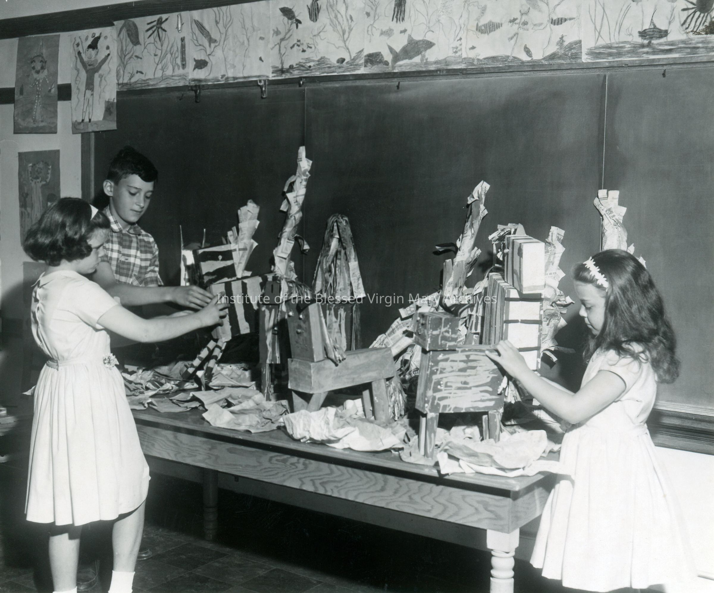 Students work on projects for summer school art fair in Sault Ste. Marie, Michigan. The event may have taken place in St. Mary's Elementary School at 360 Maple Street.