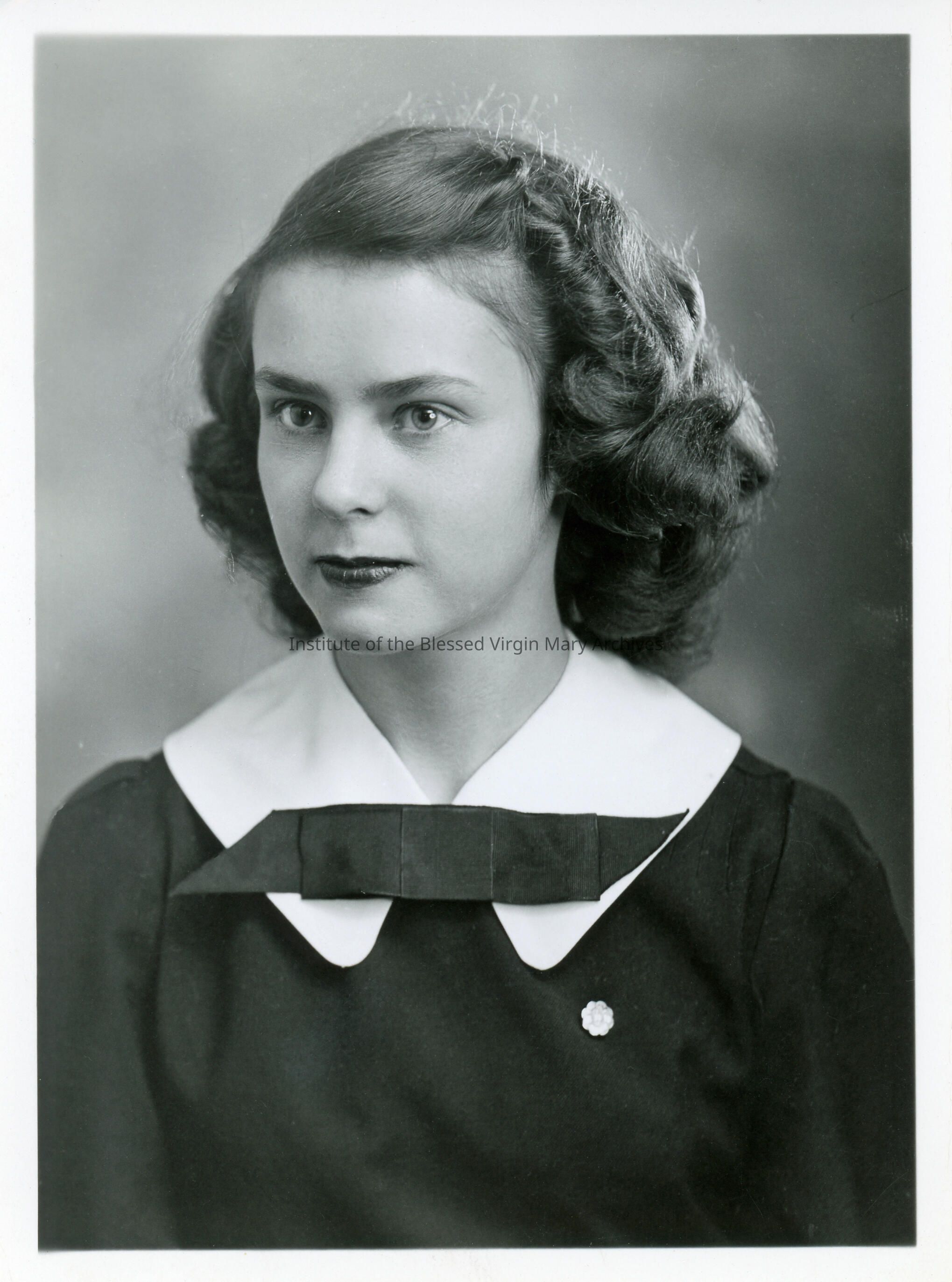 Portrait of Barbara Mansfield, a 1946 graduate of Loretto High School, formerly Loretto Academy, in Sault Ste. Marie. Founded in 1896, the academy's location at 377 Armory Place opened in 1899 and underwent a substantial addition in 1910. Converted into a co-ed high school in 1944, it was demolished in 1966 after Loretto Catholic Central High School was constructed.