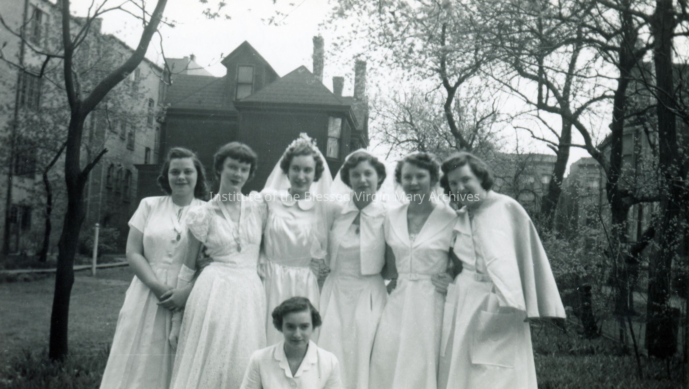 Loretto High School May Crowning in Englewood, Chicago. This image features students including Margaret Vogt (third from left) and Patricia Buckley (far right). The school was located in the 6500 block of Stewart Avenue.