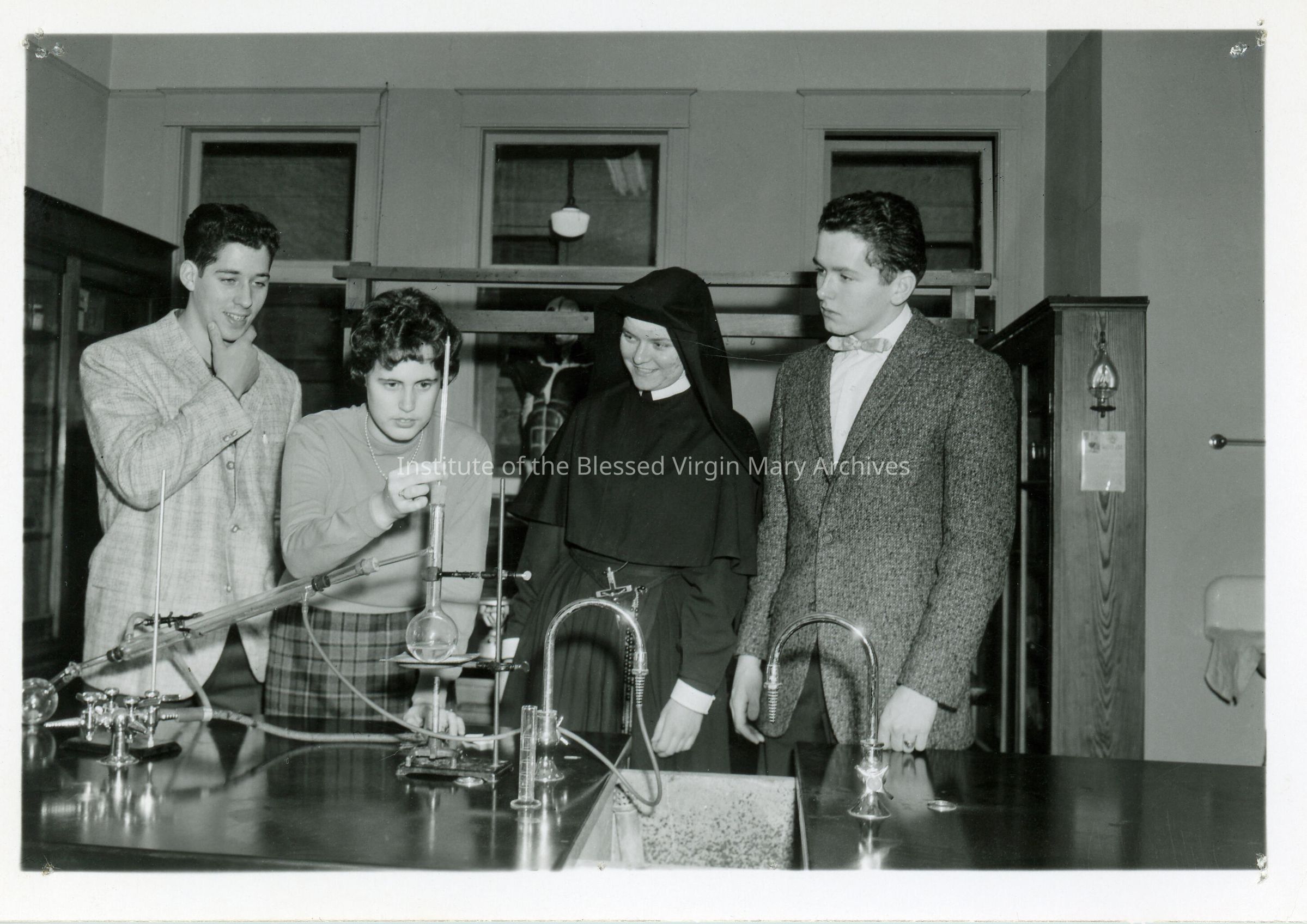 Loretto High School, formerly Loretto Academy, in Sault Ste. Marie, Michigan. This image features Sister Sara (Cecile) Manion instructing students in science class. Founded in 1896, the academy's location at 377 Armory Place (pictured) opened in 1899 and underwent a substantial addition in 1910. Converted into a co-ed high school in 1944, it was demolished in 1966 after Loretto Catholic Central High School was constructed.