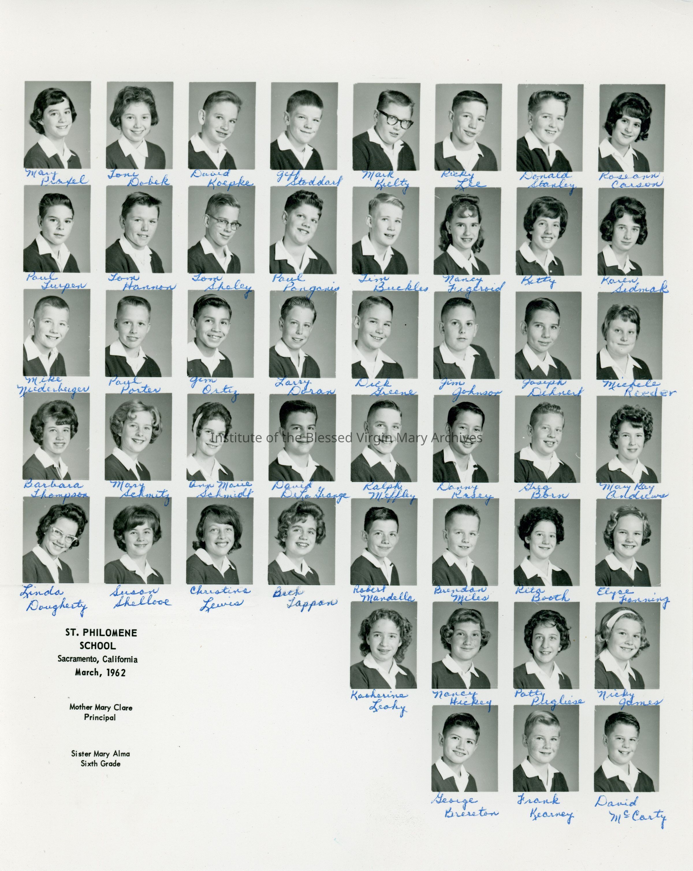St. Philomene's sixth grade class. Opened in 1949, the school was located at 2320 El Camino Avenue in Sacramento, California. Sister Miriam (Mary Clare) Mracek is listed as principal and Sister Arlene (Alma) Connelly is listed as the sixth grade teacher.