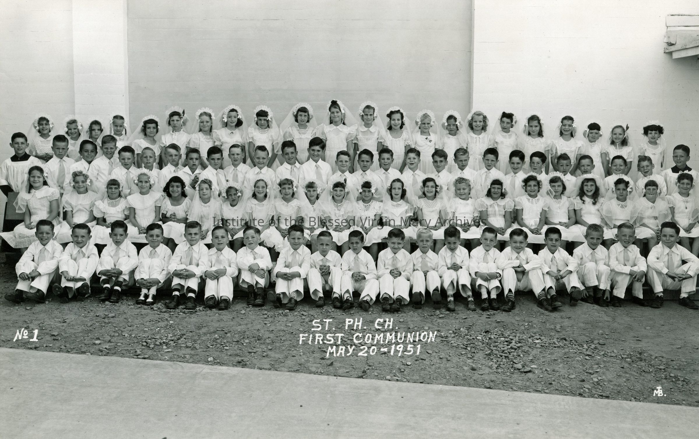 St. Philomene's School located at 2320 El Camino Avenue in Sacramento, California. This image features students celebrating their First Communion.