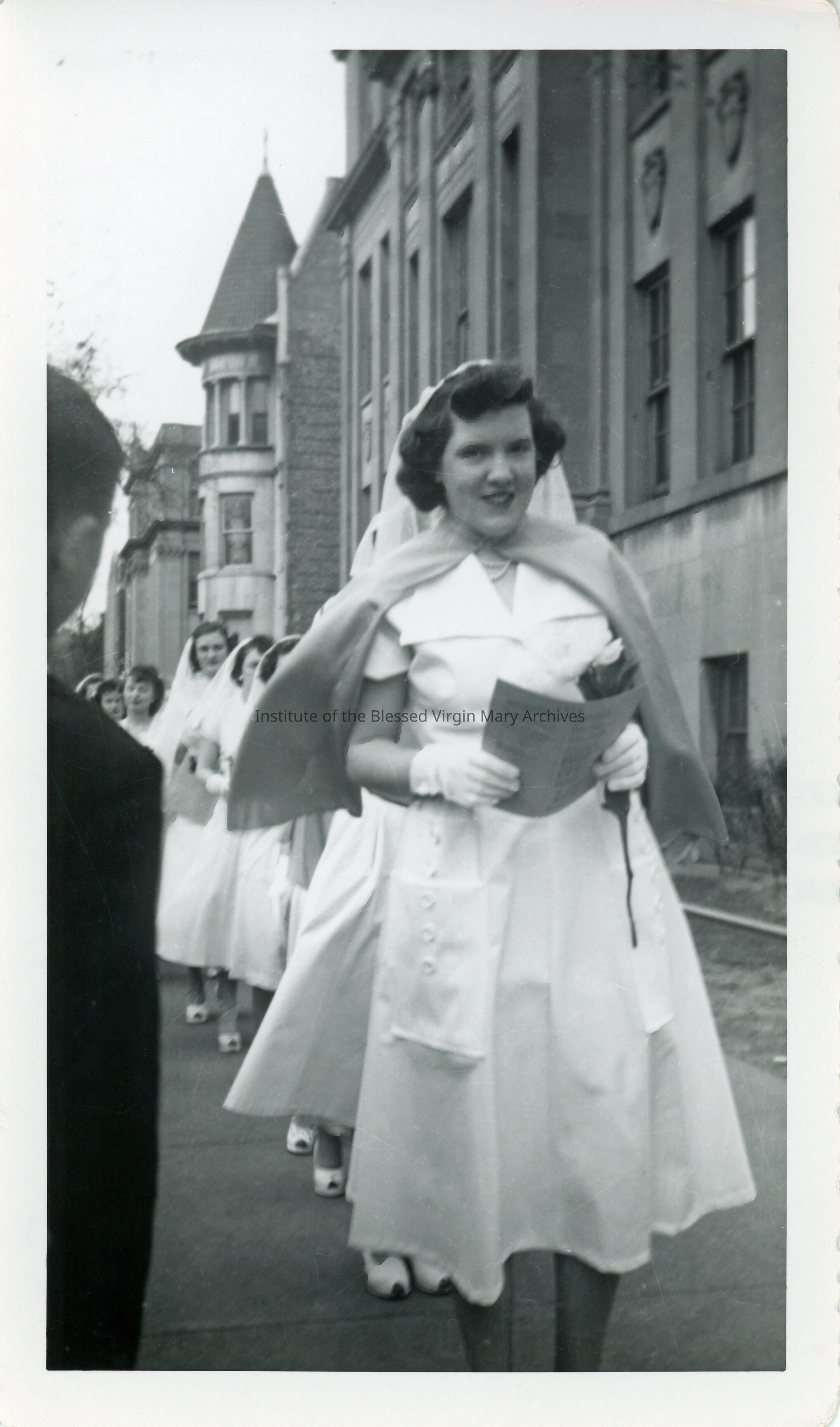Loretto High School May Crowning in Englewood, Chicago. This image features student Patricia Buckley walking down the 6500 Block of Stewart Avenue. In the background, from left to right, are Loretto High School, Loretto Convent and St. Bernard Parochial School.