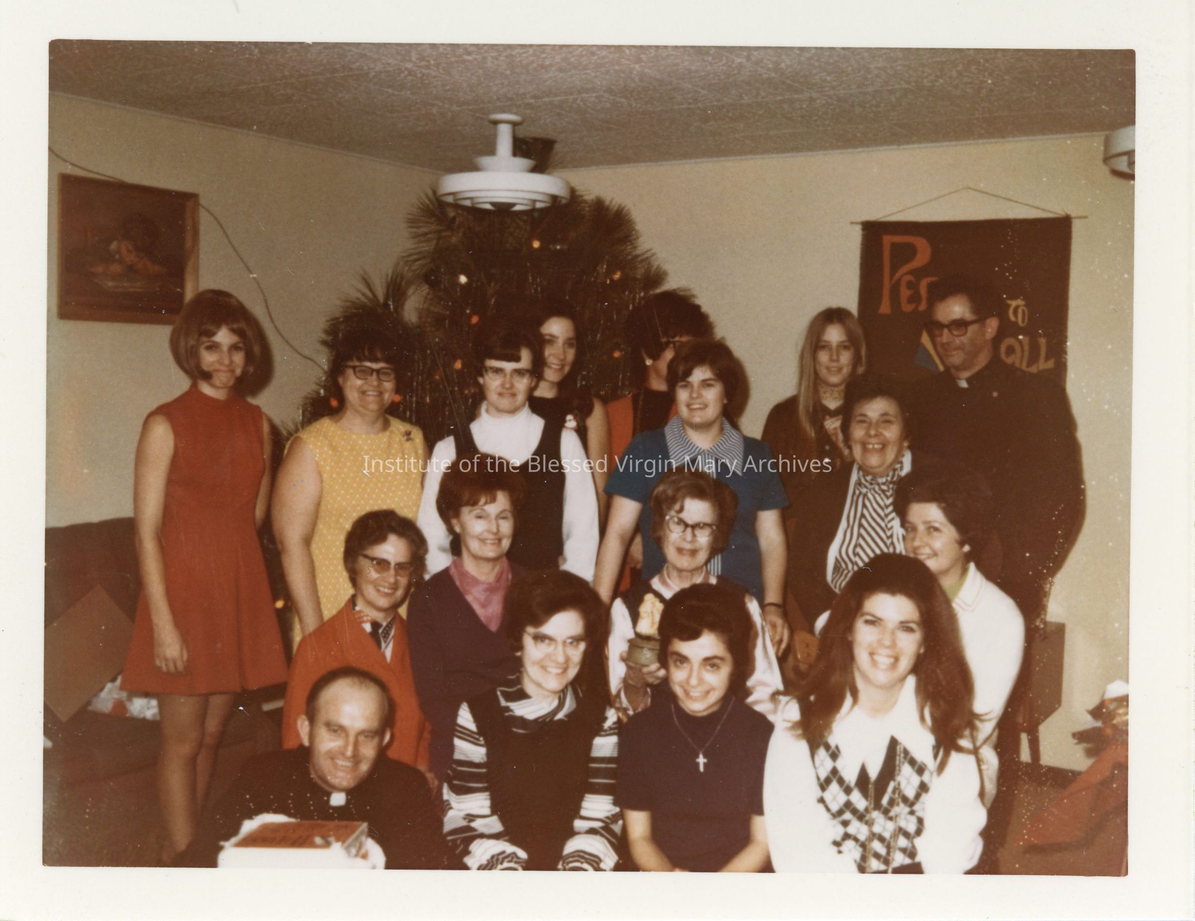Christmas gathering in the IBVM Convent at Our Lady of the Assumption Parish in Carmichael, California. In the front row, from left to right, are Father Storan, Sister Rita (St. David) Jacques, Sister Mary Lou (St. Anthony) Poerio and Mary Kay Conrad (lay teacher). In the second row, from left to right, are Sister Edith (Blanche) Turgeon, Lil Blackburn (lay teacher), Sister Beatrice (Justina) Malone and Mary Davis (lay teacher). In the third row, from left to right, are Dale Springer (lay teacher), Gen Harland (lay teacher), Sister Esther (Damian) O'Mara, Sister Mary Carton and Mary Segersten (lay teacher). In the back row, the three women are unidentified while man on the far right is Father Walter Neri.