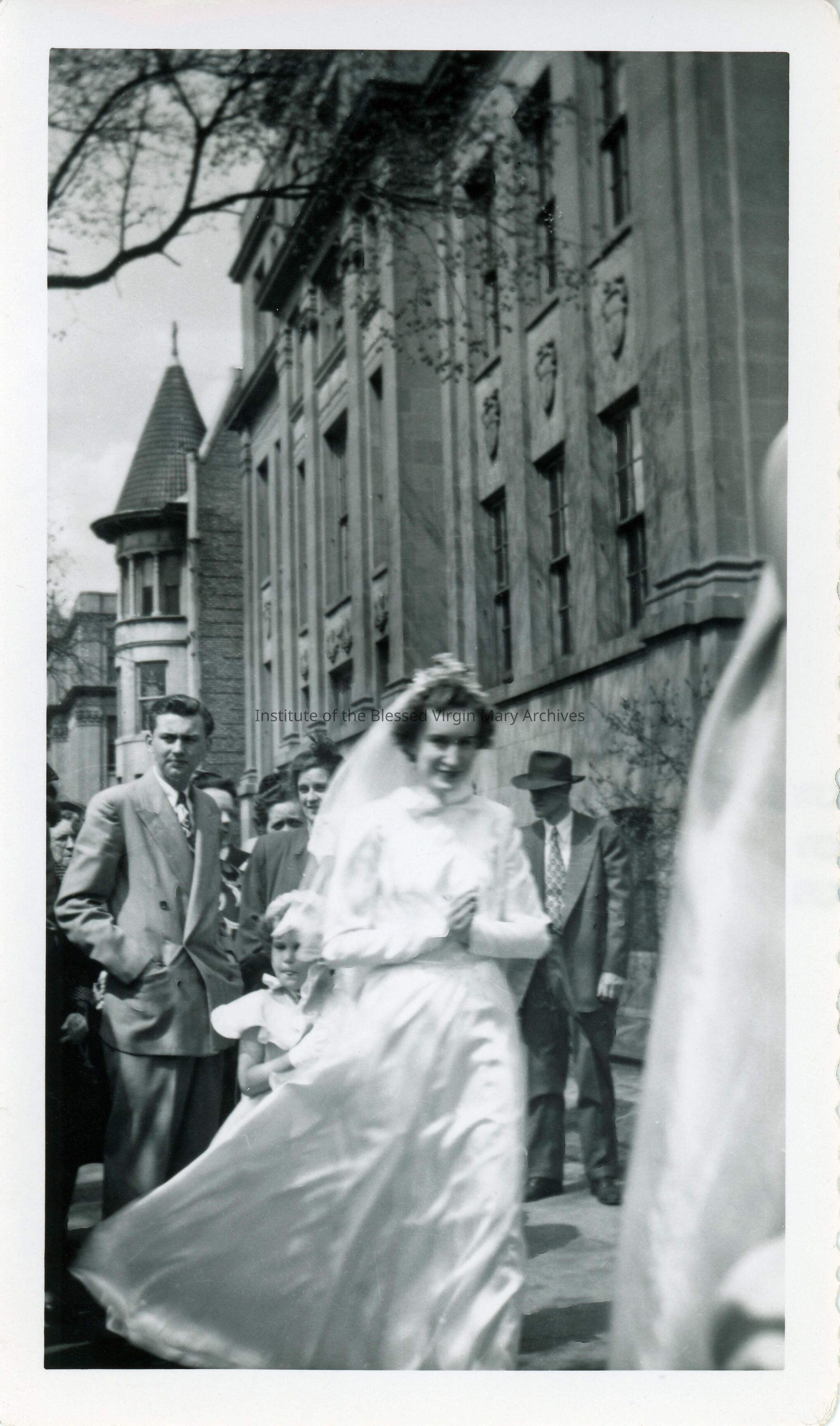 Loretto High School May Crowning in Englewood, Chicago. This image features student Margaret Vogt walking down the 6500 Block of Stewart Avenue. In the background, from left to right, are Loretto High School, Loretto Convent and St. Bernard Parochial School.