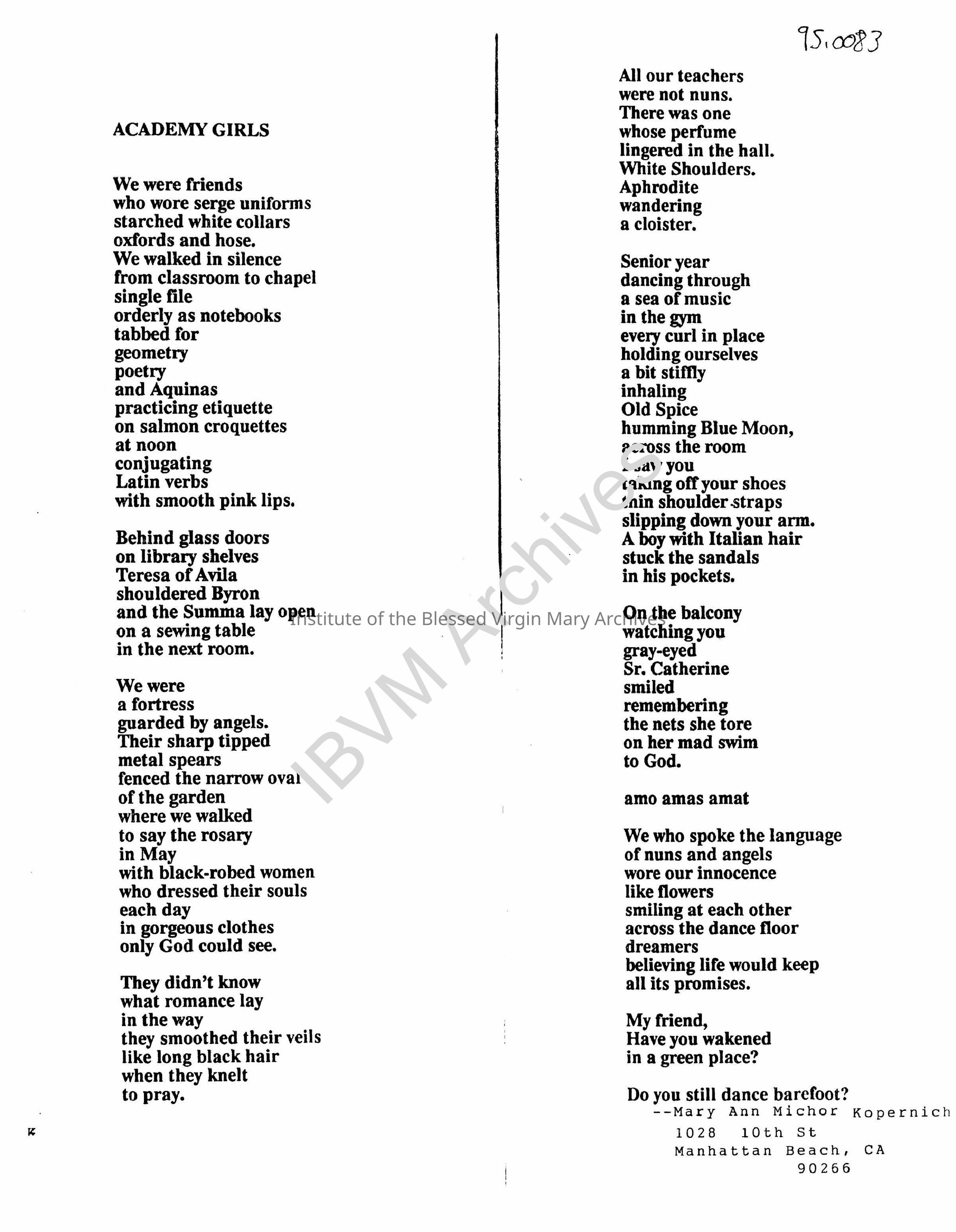 Poem titled "Academy Girls" by Mary Ann Michor Kopernich, a 1955 graduate of Loretto Academy Woodlawn.