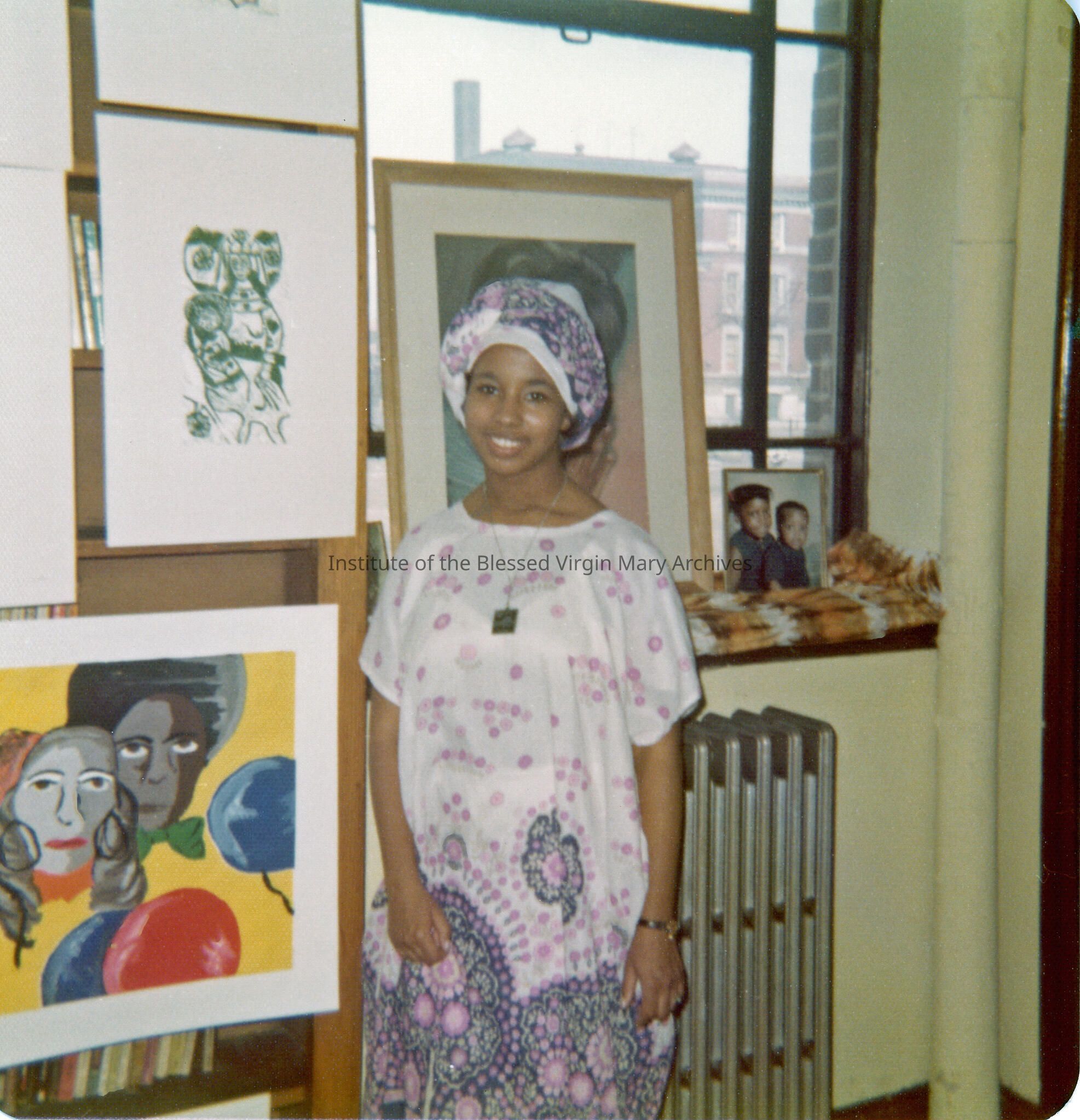 Student attending African Heritage Day. This event may have been sponsored by the Loretto Adult Education Center. Founded in 1964, the LAEC program worked to improve literacy, provide job training and award high school diplomas to low income adults and young adults.