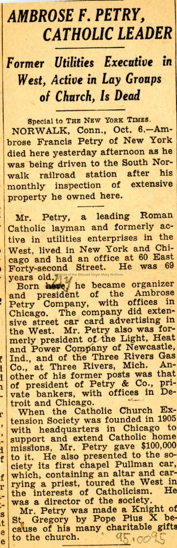 Obituary for Ambrose F. Petry, brother of Sister Marie (Seraphina) Petry. Ambrose was a longtime benefactor of the Woodlawn IBVM.