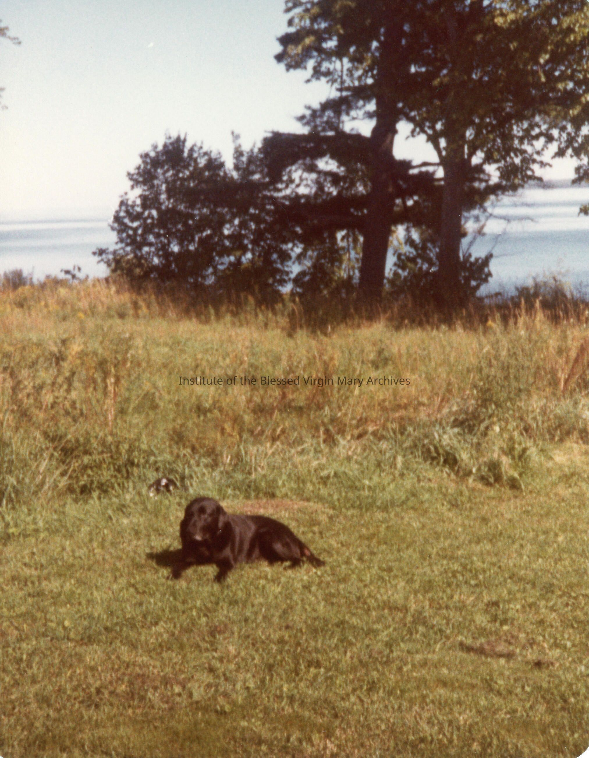 Keweenaw Bay in Assinins, Michigan. A black dog rests in the grass. This property is part of the L'Anse Reservation.