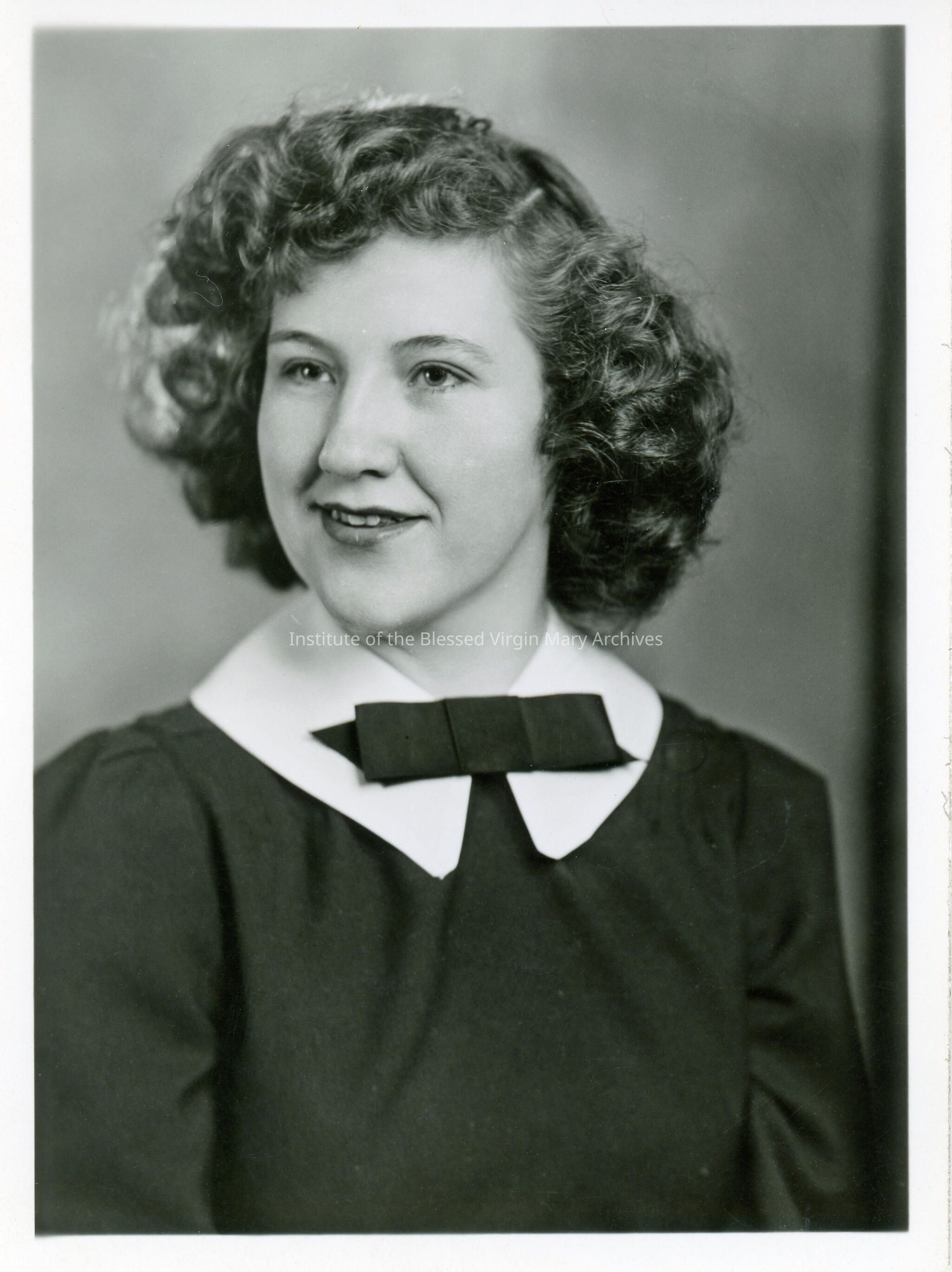 Portrait of Blanche Riggs, a 1946 graduate of Loretto High School, formerly Loretto Academy, in Sault Ste. Marie. Founded in 1896, the academy's location at 377 Armory Place opened in 1899 and underwent a substantial addition in 1910. Converted into a co-ed high school in 1944, it was demolished in 1966 after Loretto Catholic Central High School was constructed.