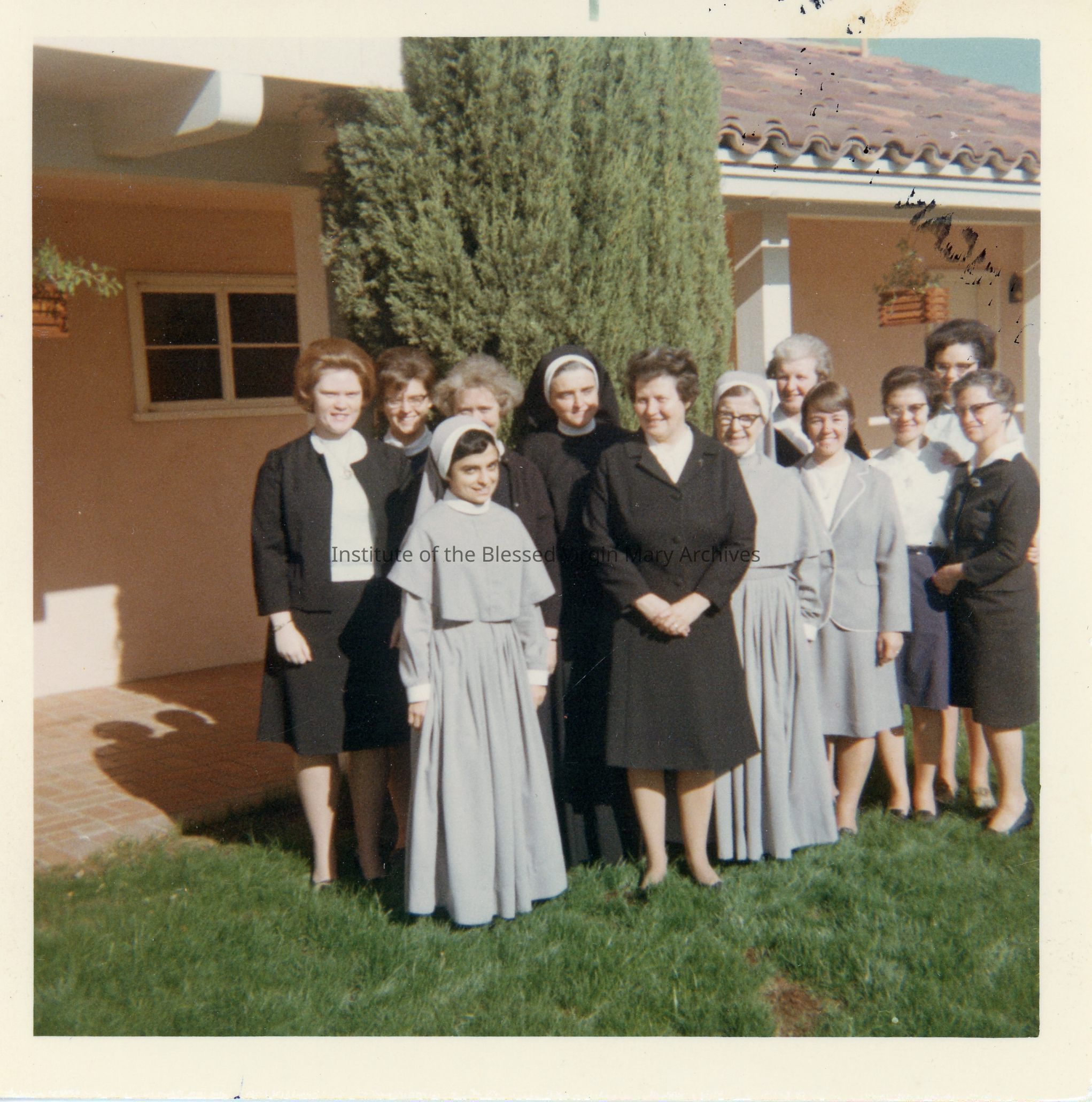 The IBVM Convent at Our Lady of the Assumption Parish in Carmichael, California. This image features Sisters gathered outside. From left to right are Sister Barbara (Joanne) Nelson, Sister Kristina (Miguel) Spejcher, Sister Mary Lou (St. Anthony) Poerio, Sister Deborah (St. Thomas More) Arment, Sister Catherine (Perpetua) Hanlon, General Superior Sister Mary Bernadette, Sister Beatrice (Justina) Malone, Sister Patricia (Anastasia) O'Connor, Sister Dolores Ann (Evelyn) McCloskey, Sister Rita (St. David) Jacques, Sister Joan (Mary Cyrene) Emmett and Sister Edith (Blanche) Turgeon.