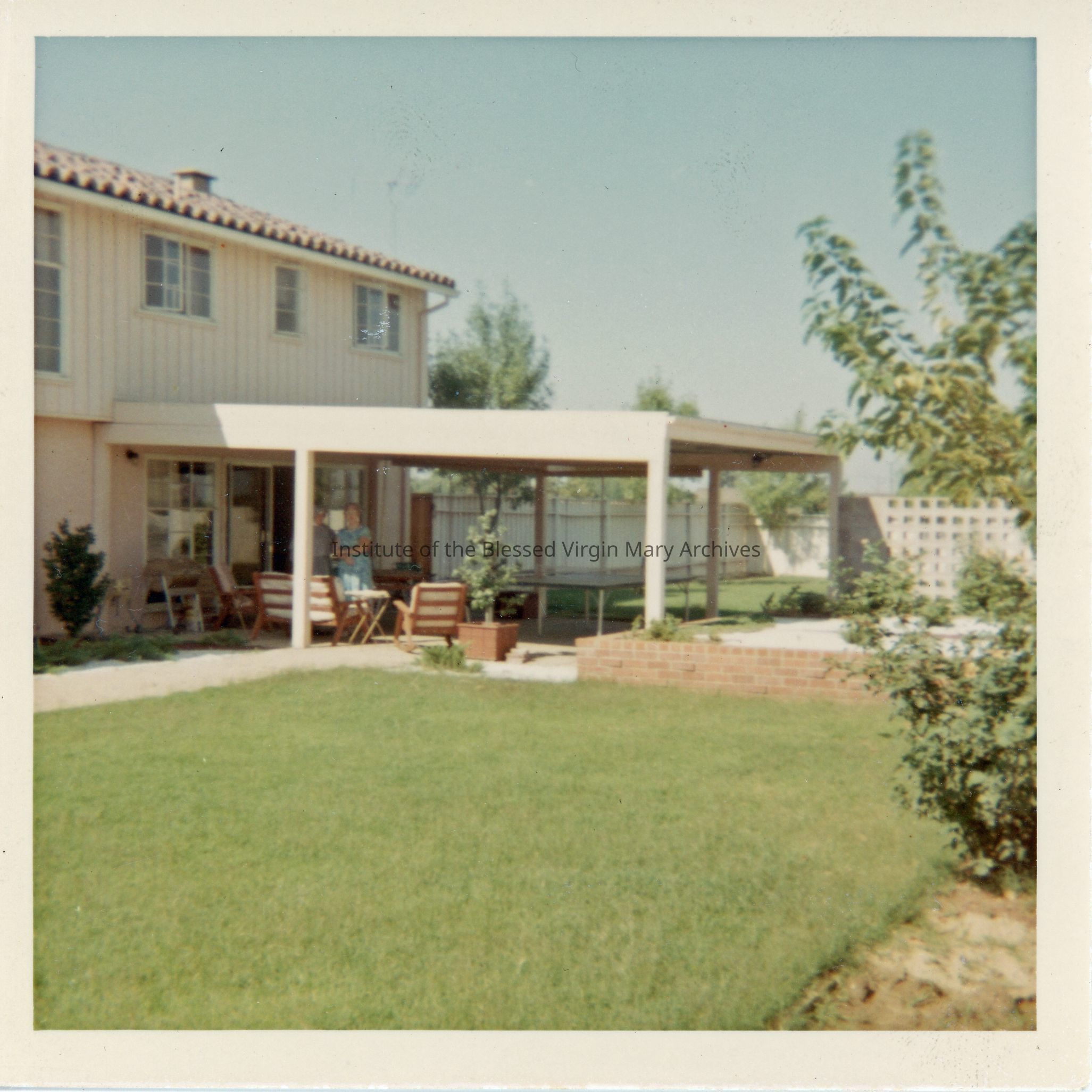 The IBVM Convent at Our Lady of the Assumption Parish in Carmichael, California. There are two unidentified women on the backyard patio.