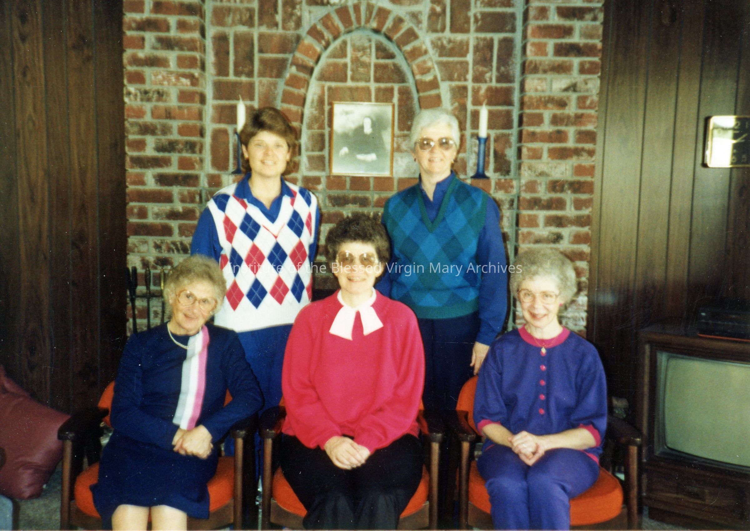The IBVM Convent at Our Lady of the Assumption Parish in Carmichael, California. In the first row, from left to right, are Sister Edith (Blanche) Turgeon, Sister Arlene (Alma) Connolly and Sister Catherine (Celine) Oliva. In the second row, from left to right, are Sister Elaine Iwanski and Sister Mary Ellen (Roland) Beck. An image of Mary Ward hangs on the wall.