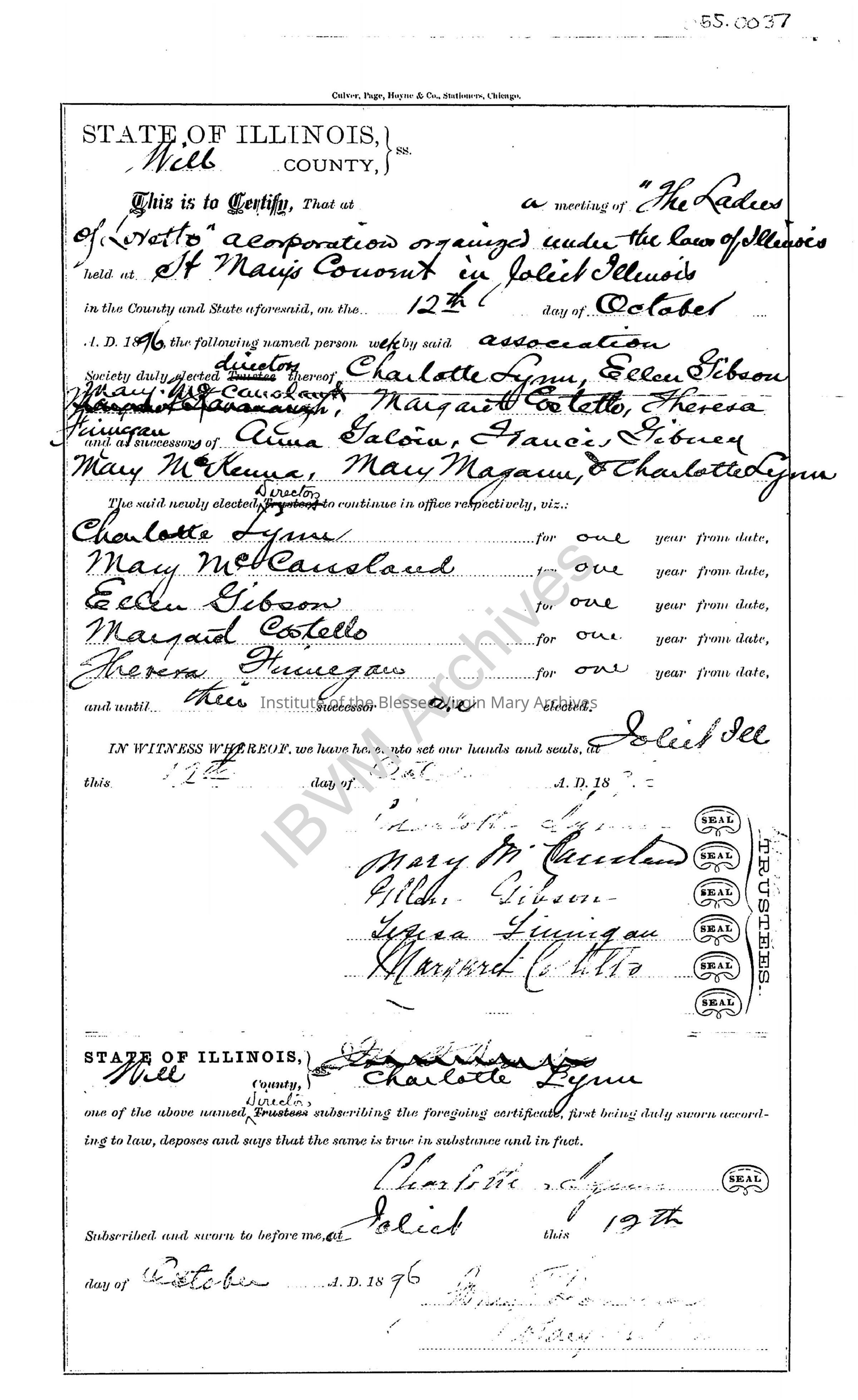 Certification of Election of Directors for the "Ladies of Loretto" signed on October 12th, 1896. There are a number of Sisters listed including Sister Charlotte Mary (Angels) Lynn, Sister Mary (Chistina) McCausland, Sister Ellen (Blandina) Gibson, Sister Margaret (Bride) Costello, Sister Teresa Finnegan, Sister Anna (Gonzaga) Gallivan, Sister Frances (Dosithea) Gibney, Sister Mary (Agnes) McKenna and Sister Mary Magann.