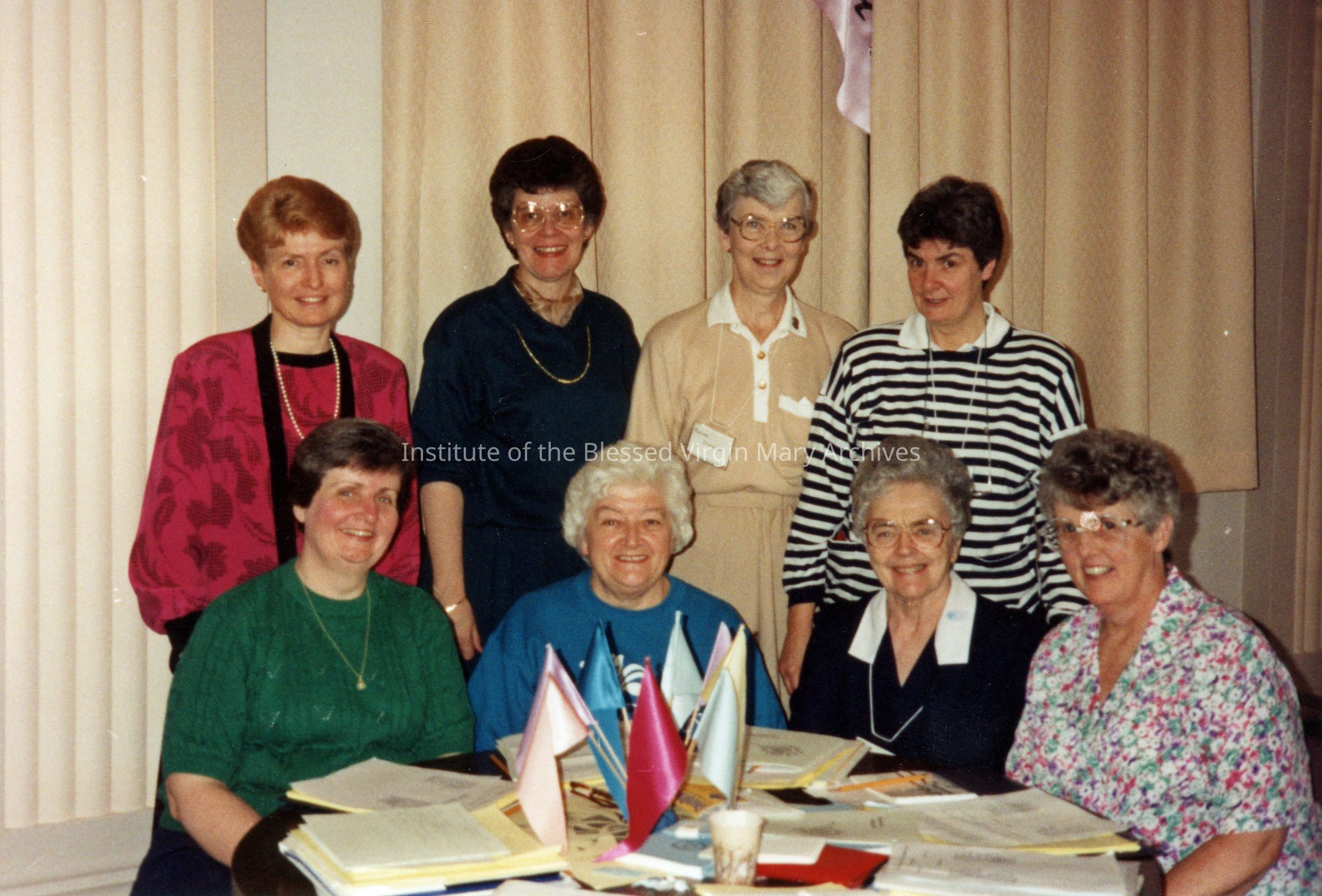 Sisters gathered for Chapter around 1991. In the back row, from left to right, are Sister Frances (Maria Regina) Bierer, Sister Arlene (Alma) Connelly, Sister Kathleen (Miriam) Scanlon and Sister Ann Manuel. In the front row, from left to right, are Sister Cathy Wendel, Sister Nora (St. Catharine) Lowe, Sister Annette Lynch and Sister Angelina Shannon. This image may have been taken in Canada.Context