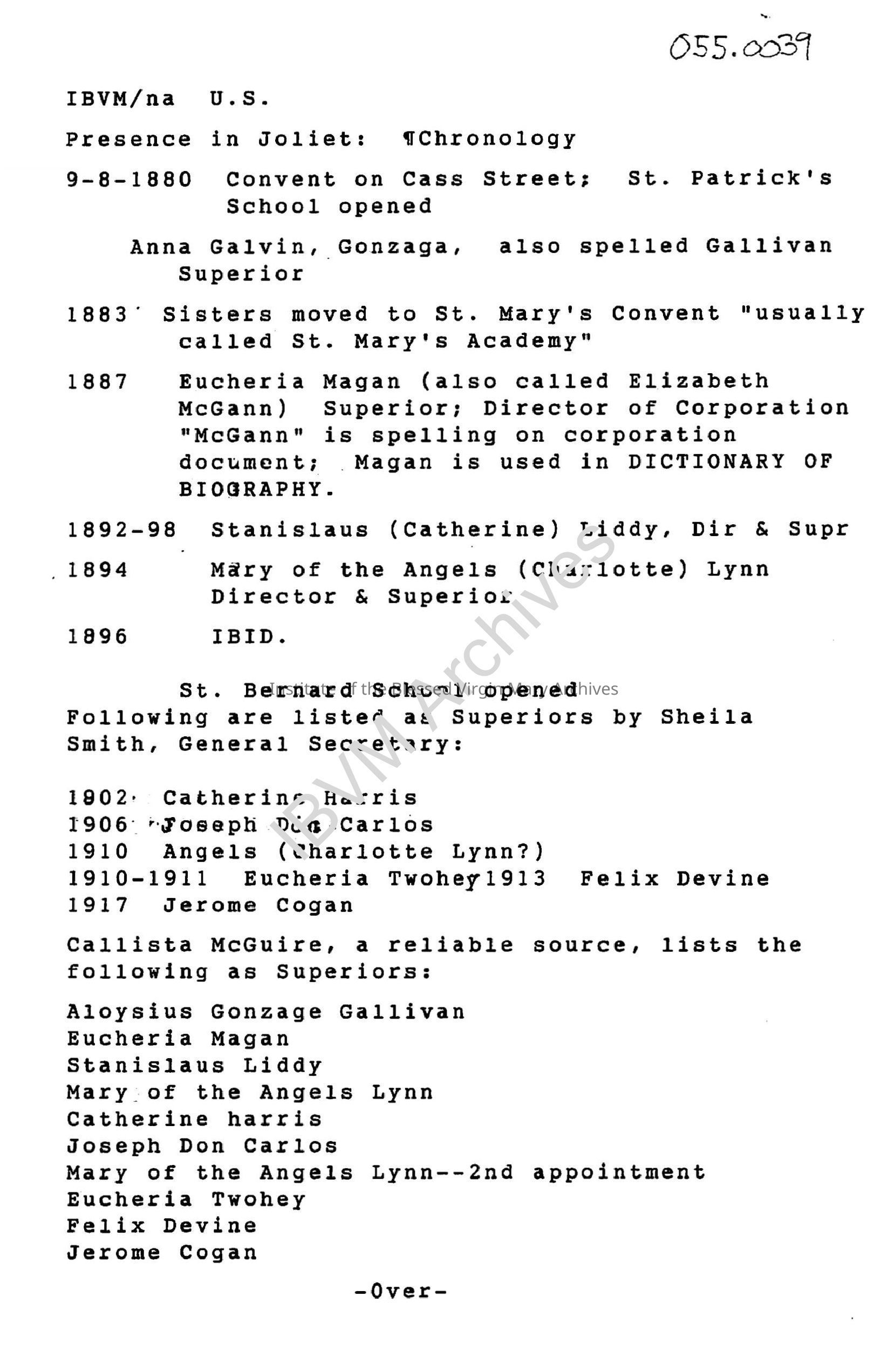 Chronology of the Institute of the Blessed Virgin Mary in Joliet, Illinois from 1880 - 1920. Includes a number of important dates and events ranging from the opening of St. Patrick's School to the closing of St. Mary's Parochial School. Also includes a list of Mother Superiors and other related information. An invitation for the Sisters to teach at St. Raymond's Cathedral School in 1982 is also mentioned.