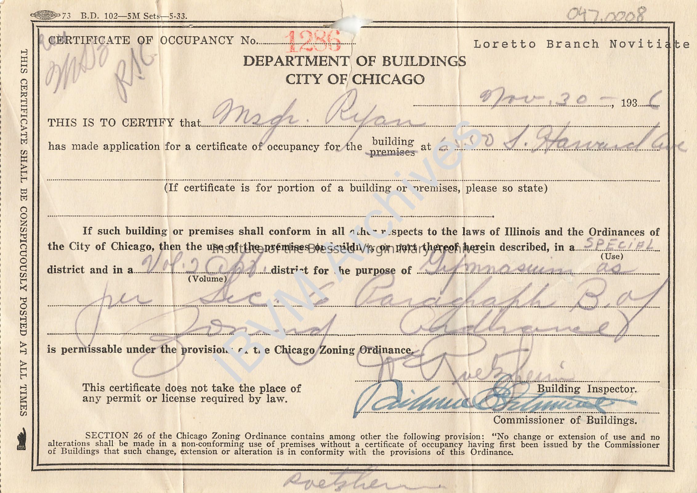 Certificate of Occupancy issued by the City of Chicago for 6550 South Harvard Avenue in Englewood. This structure was the first Loretto Novitiate in the United States.