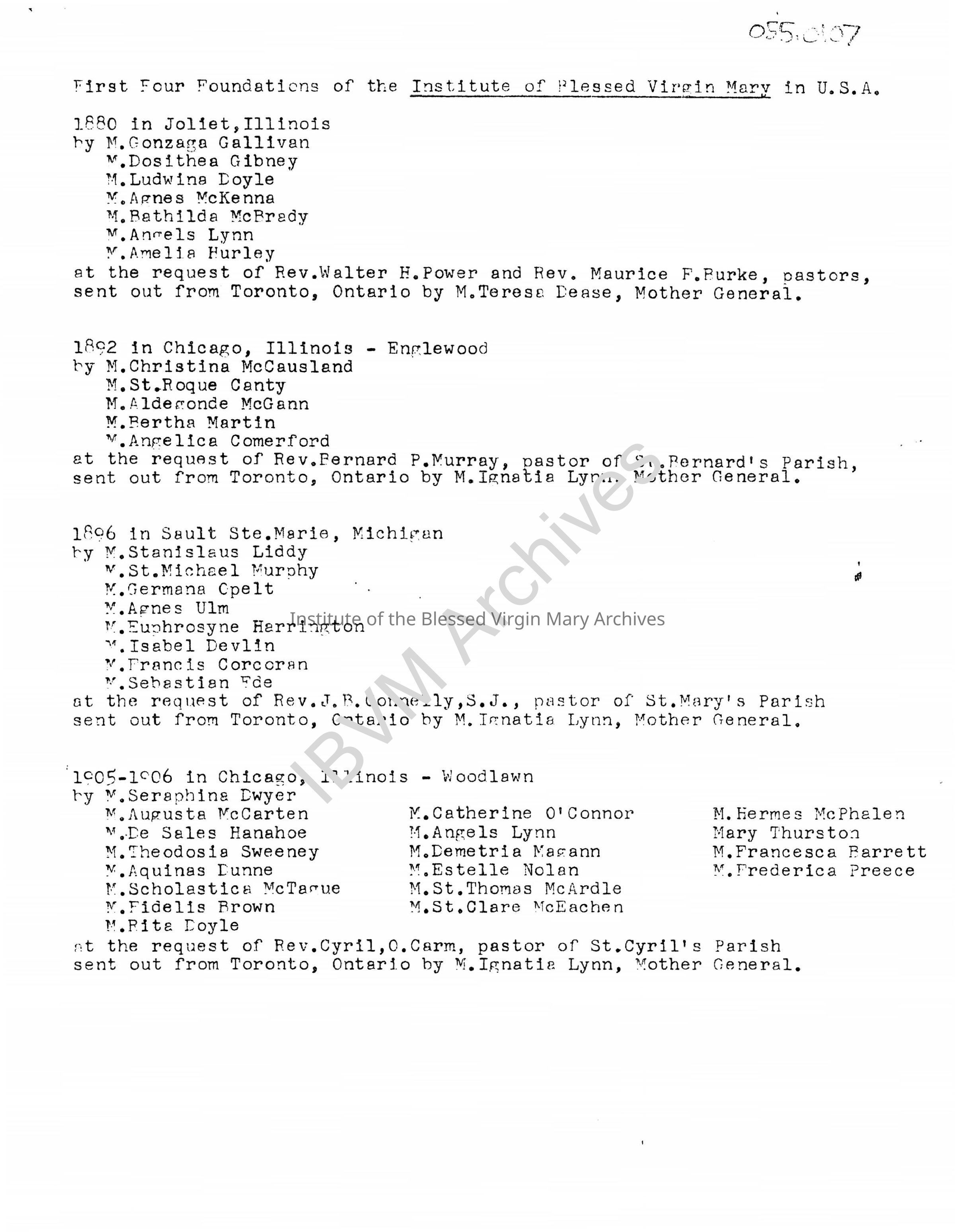 Early History of the IBVM in the United States. It lists the dates and sisters of the first four foundations in Joliet, Englewood, Sault Ste. Marie and Woodlawn. Other locations mentioned include St. Bernard's Convent, Loretto High School, St. Bernard's Church and Loretto Convent. There is also an accompanying list of superiors in Joliet and Englewood.Context