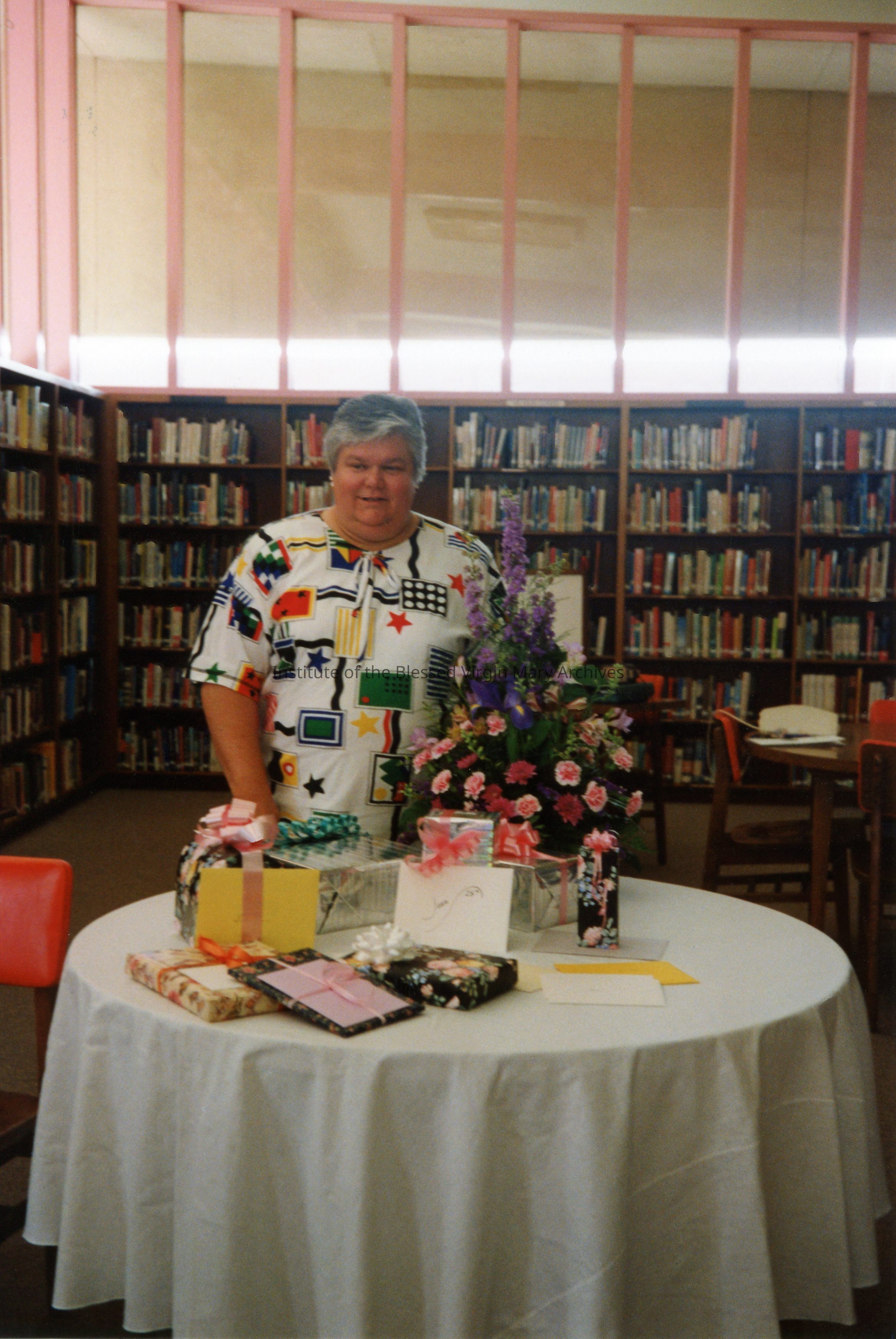 Gathering for Sister Jean Frye at Loretto High School in Sacramento, California. Sister Jean is pictured near a table of gifts. The event took place in the school's library.