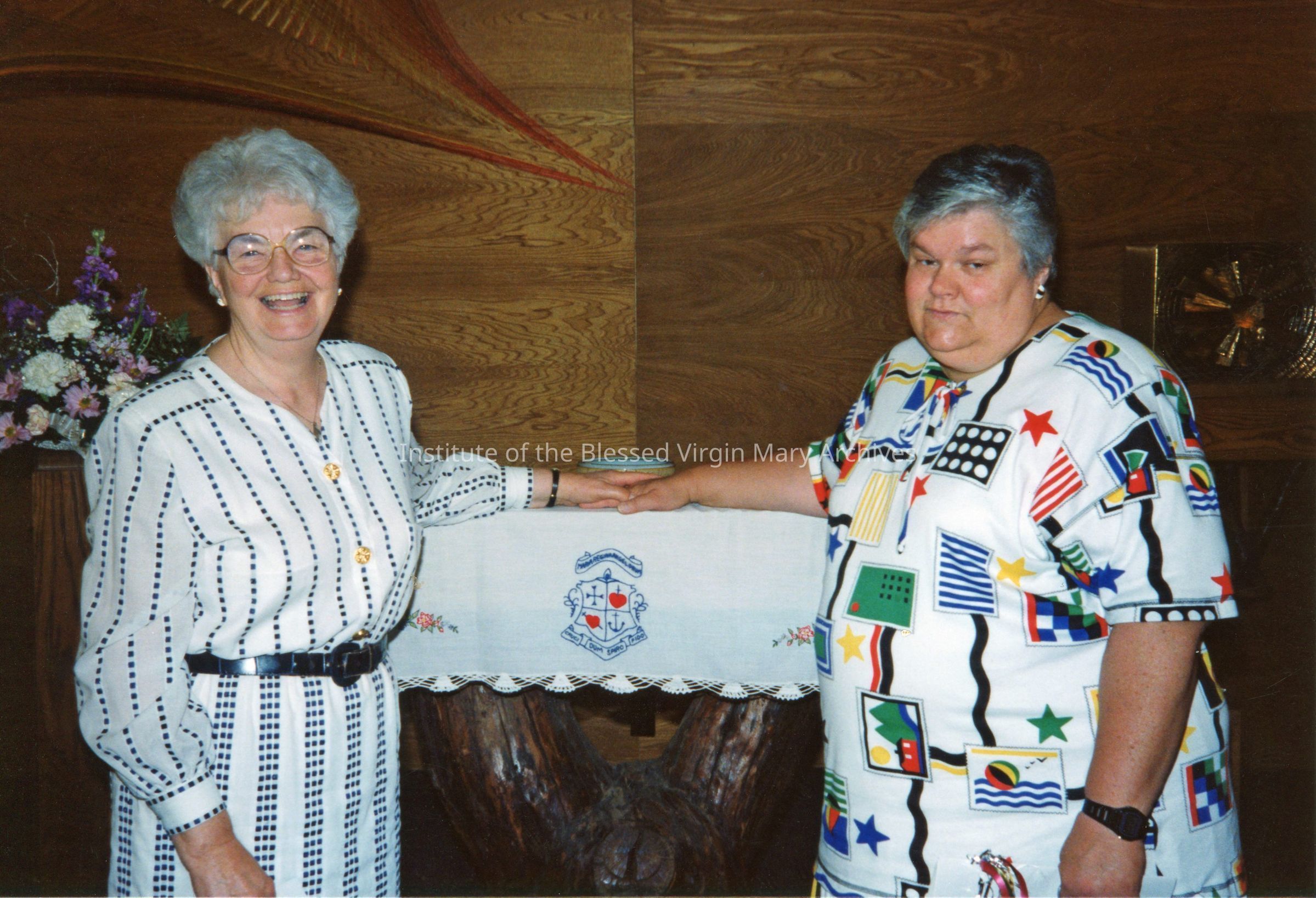 Gathering for Sister Jean Frye at Loretto High School in Sacramento, California. Standing on the right, Sister Jean is pictured in the school's chapel. The woman on the left is unidentified.