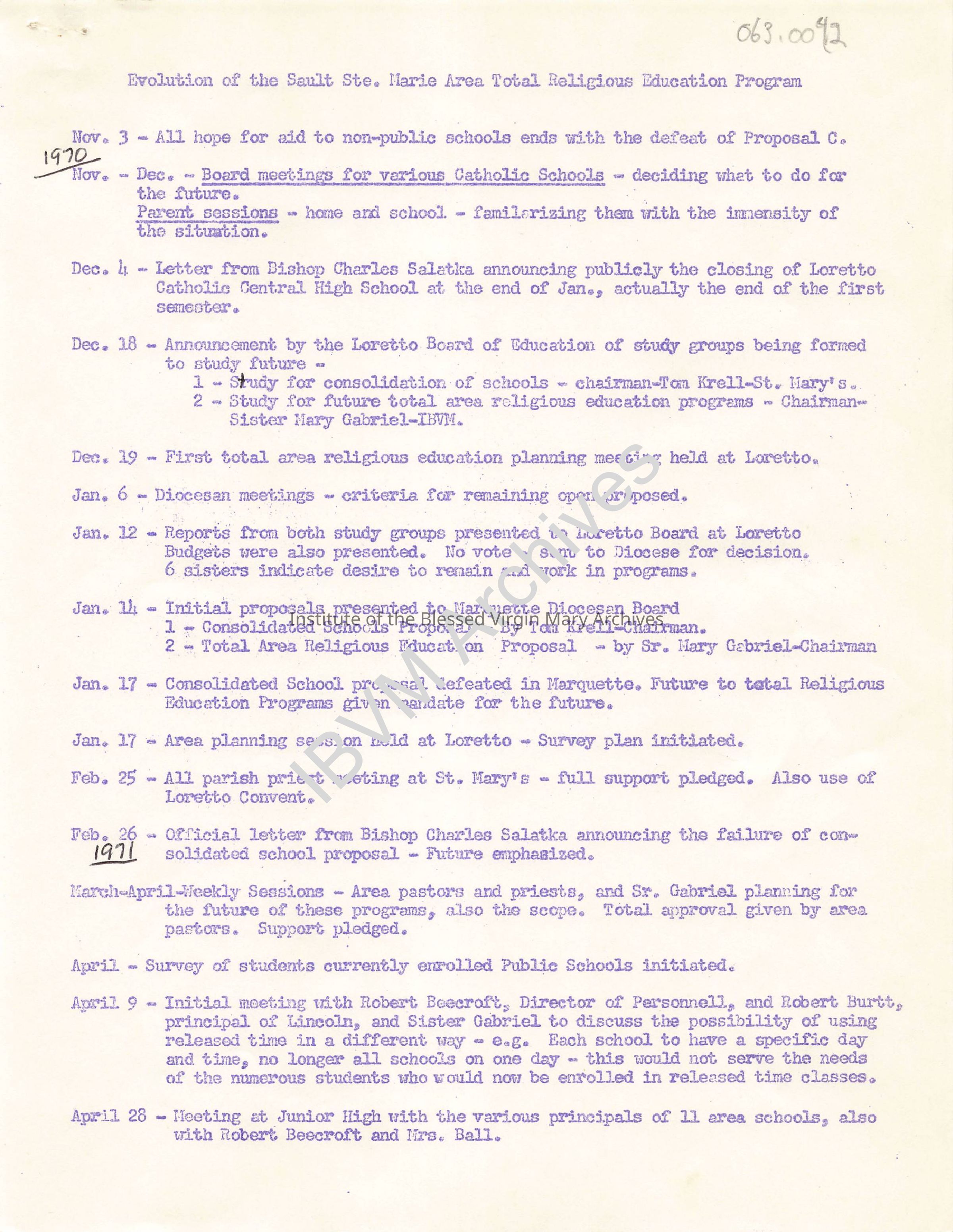 Evolution of the Sault Ste. Marie Area Total Religious Education Program. It includes a timeline of events covering the years 1970 - 1971. With a focus on continuing Christian development, the Sault Area Religious Education and Service Program was initiated after the closure of local Catholic schools in 1971 and continued until 1984.